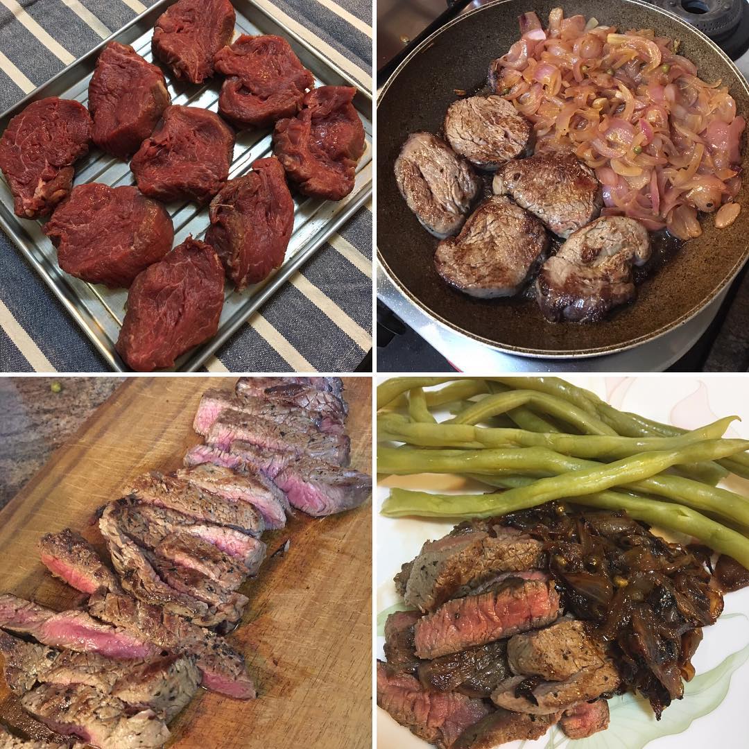 塩胡椒、バター、ニンニクなどがあれば、十分においしいステーキとなる。玉ねぎをじっくりと炒め、白ワインやしょうゆなどで軽く味付けをしたものを添えるも旨し。