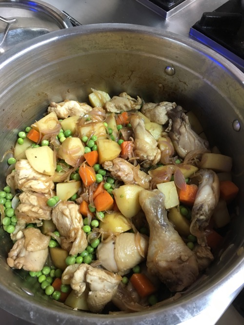 丸鶏を捌いて、玉ねぎ、じゃがいも、にんじんとともに「鶏じゃが」を作る。