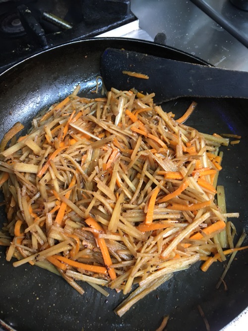 どこから見てもきんぴらごぼう! 味見をする。わたしにはおいしい。でもシェフは無口。わかった。味が足りないのね。七味とうがらしがあったので、どさどさと振りかける。