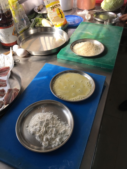 イワシを捌いて開いたあと、フライの準備。