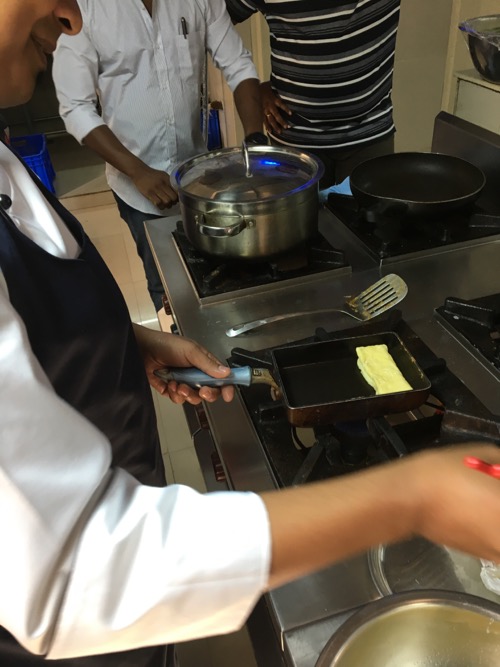 このシンプルな卵焼きは、絶対に物足りないと言われること請け合いだったが、シンプルなものを作りたくて、あえて自分の卵焼き用フライパンを持参。一度焼き方を示したら、すぐに習得するシェフ。さすがシェフ!