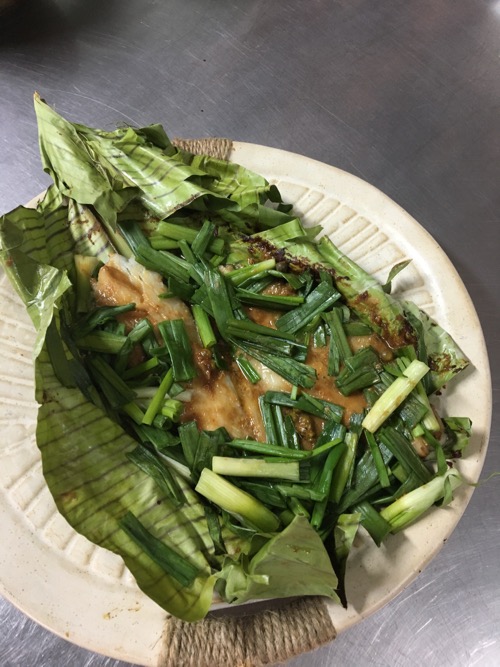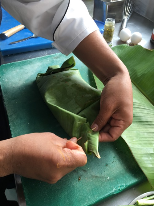 インディアン・サーモンは、パーチメント・ペーパーの代わりにバナナの葉で包む。これは前夜の「調理実習@遅すぎる新年会」での実験結果を生かし、バナナの葉を多めにして包んだ。