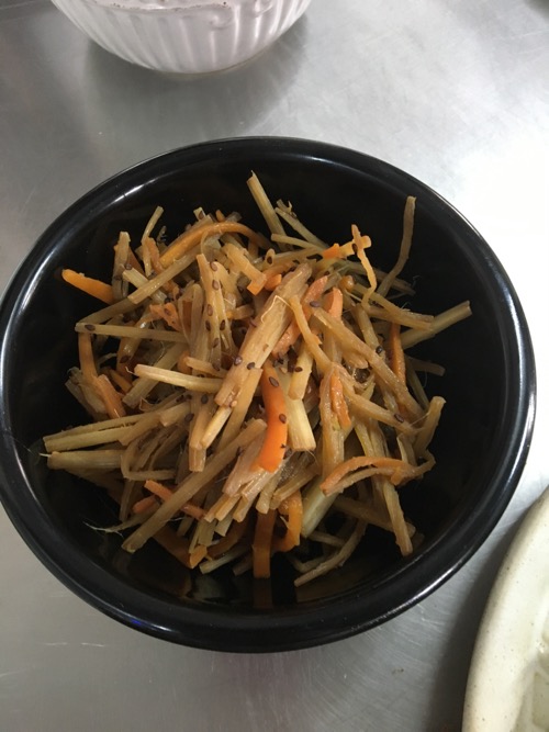 こちらは、毎度おなじみ「健康にとてもよいバナナの茎」を使ったきんぴらごぼう。ニンジンとともに、ごま油で炒める。