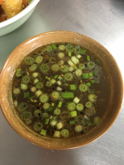 鶏ガラで作ったスープ。しょうゆ、バルサミコ酢、塩でかなり濃厚な味に。