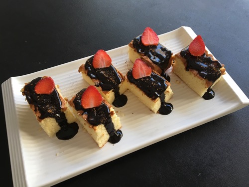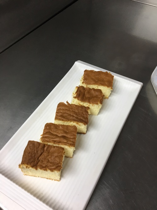 ペイストリーシェフ、たいへん得意な感じで、カステラにデコレーション。原型を留めぬ自由奔放さ。