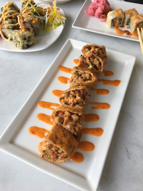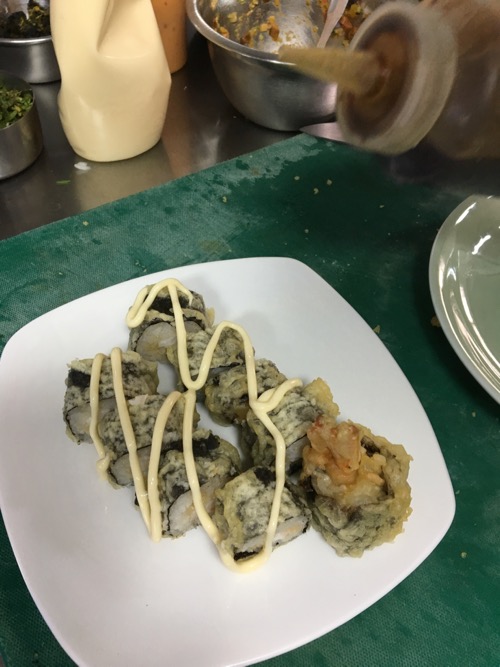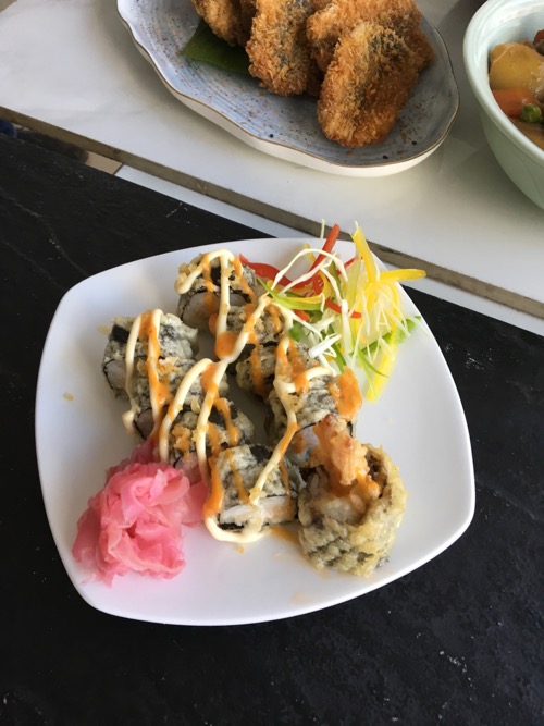 そして、こちらはシェフによる巻き寿司系。ソースたっぷり。こういうタイプの料理は、オリエンタル料理店で、アジア各地料理の一つとして日本料理メニューがある場合によく見られるアレンジだ。
