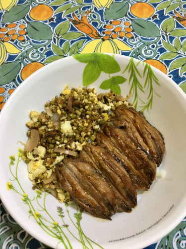 残りの発芽豆を玉ねぎと炒め、ついでに卵も入れて、炊きたてご飯に載せれば、なんともおいしいランチの完成だ。