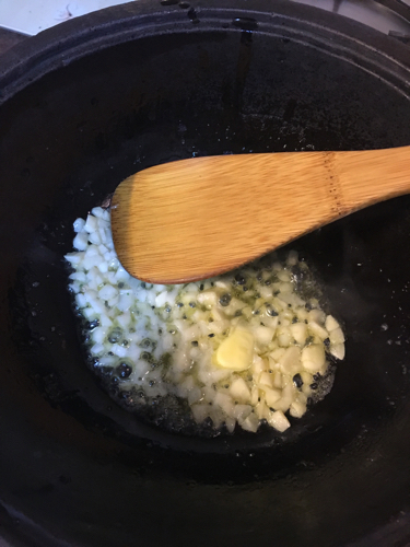 クラッシュしたにんにくを、オリーヴオイルとバターで炒める。