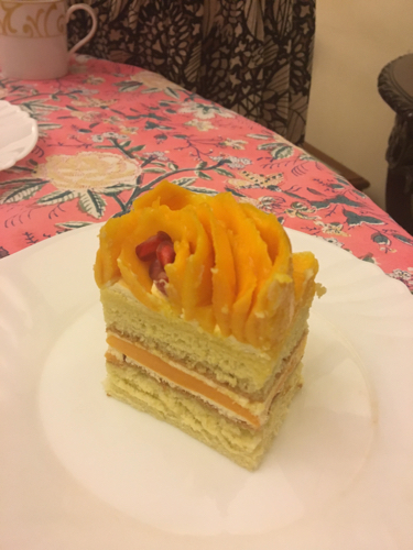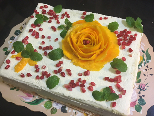 そして、マンゴーを薄く切り、バラに見立てて作ってみた。ザクロは朝のジュース用の余りを使い、ミントは庭から摘んできた。部位によってマンゴー量が大幅に違うところが味わい深いというものだ。