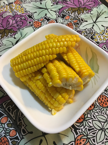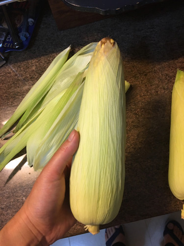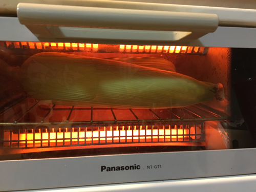 トウモロコシを丸ごと、皮を適度に残してオーヴン、もしくはオーヴントースターへ。