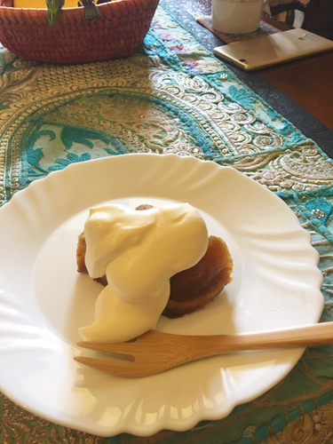 タルト・タタンは逆さまにして、りんごの形が残っているところがポイント。甘みが結構強いので、砂糖を加えていない生クリームをトッピングに添える。