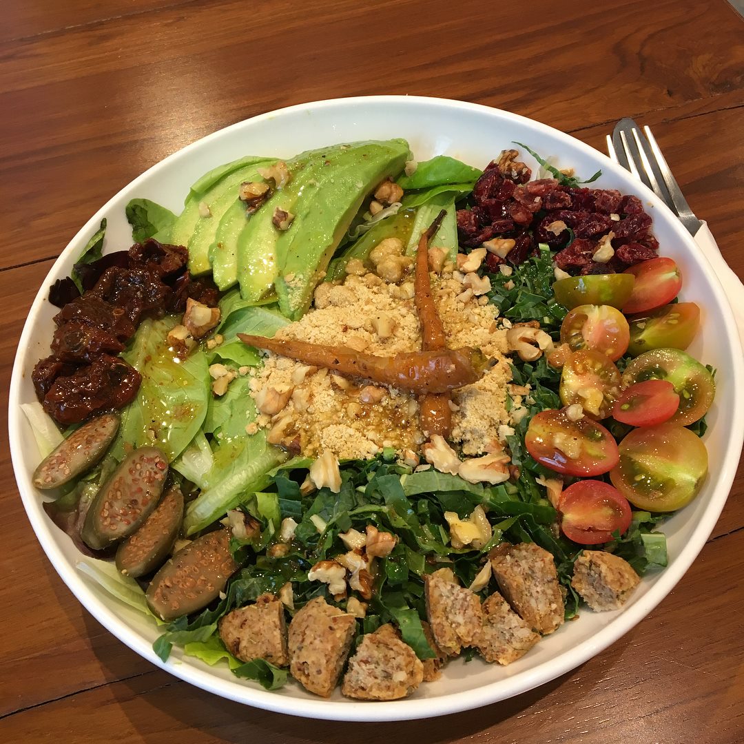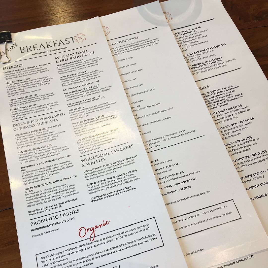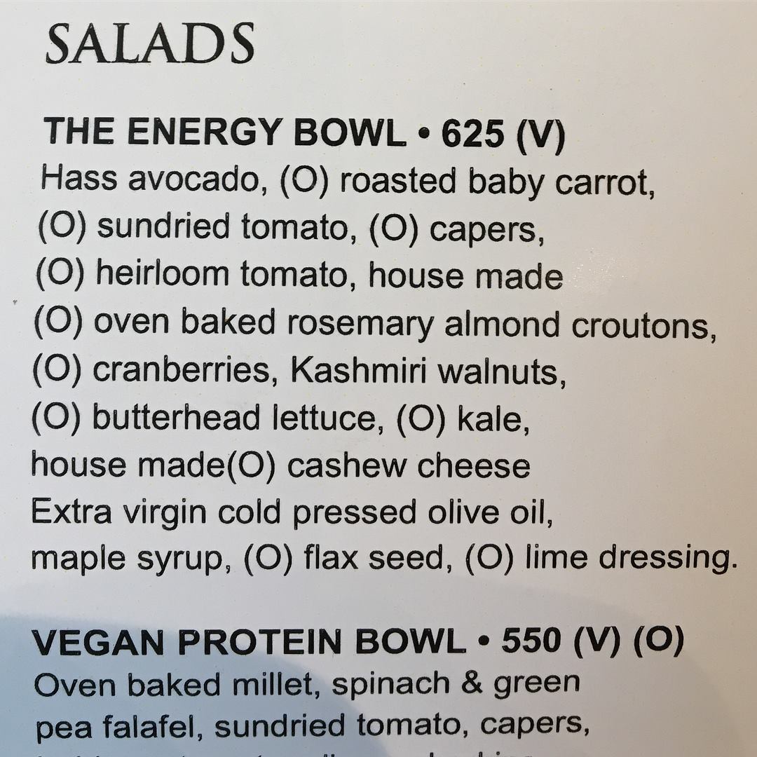 読み込むべき「資料」のような メニューを眺め、お勧めの料理をいくつか尋ね、エナジーボウルというサラダを注文。オーガニックの素材には、ひとつひとつに、(O)と明記されている。ヴィーガンメニューや乳製品を使わないメニューもある。