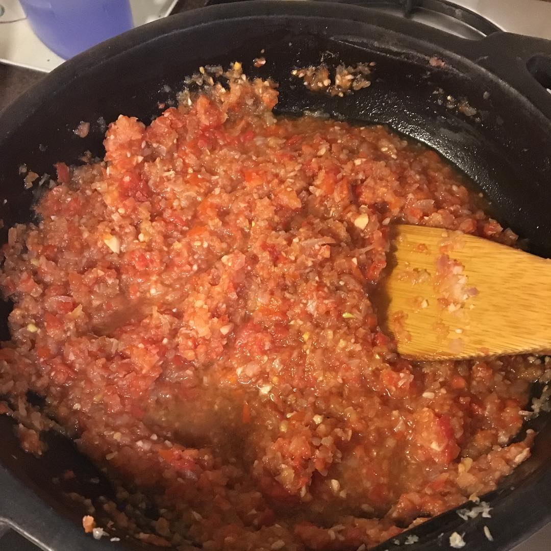 玉ねぎとニンニクをブレンダーにかけて炒め、トマトもまたブレンダーにかけてジュースに。それらを煮込む。北東インドのマニプル産の石鍋で煮込む。石鍋からミネラル分が染み出すらしい。健康にいいらしい。この状態からインド料理に持っていくこともできるが、今日はイタリアンテイストに。茅乃舎の野菜だし、天然塩、粒胡椒、醤油、バルサミコ酢で味付けて、煮込む。