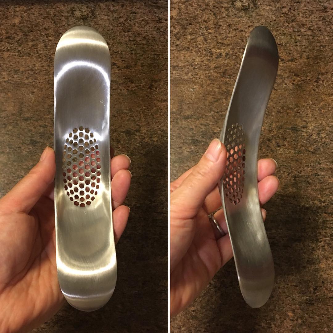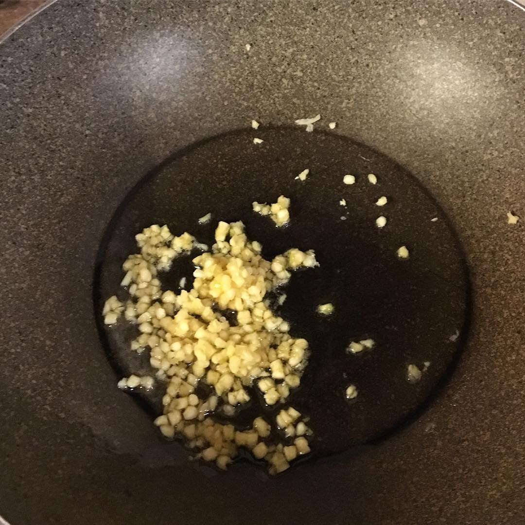 いつものように、ごま油でにんにくを炒める。以前も食ブログに書いたが、このガーリック・クラッシャー (Joseph Joseph)は史上最高に使いやすい。使いやすい上に、ぐいぐい潰すのは楽しい。本体がプラスチック製のものもあるが、全体にステンレス製のほうが丈夫でお勧め。これはニューヨークで買ってきたが、インドでも売っている。amazon.inでも売っているが、チープな類似品にご注意だ。