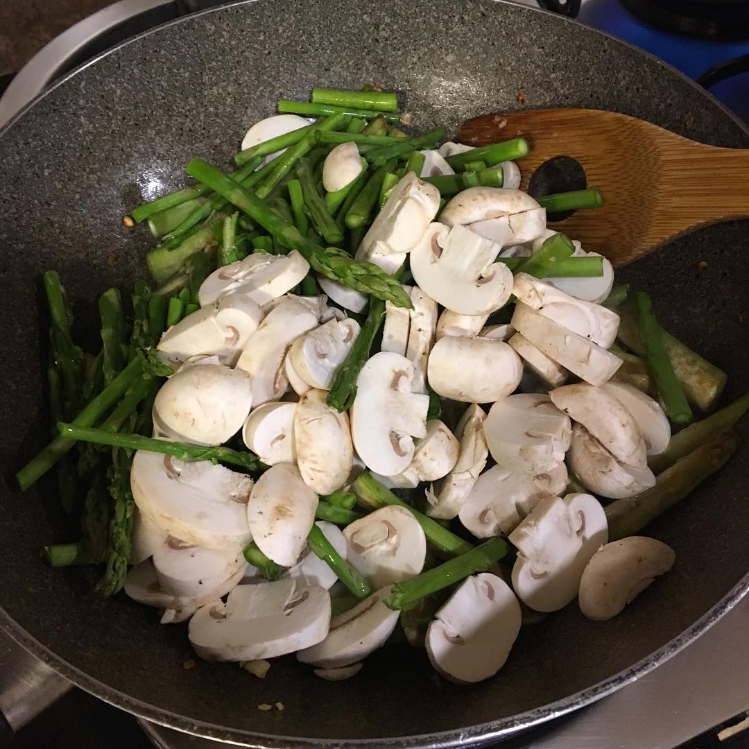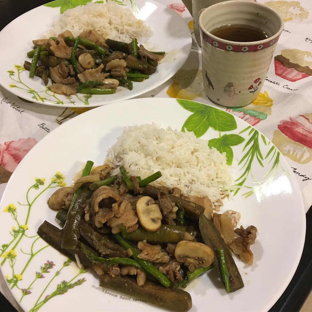 昨夜はナスの残りを炒め、更にマッシュルームとアスパラガスを炒め、適当和風テイストに味付けした豚肉をどんと炒める。日本では、最低限の調味料しか購入しないが、YOUKIの甜麺醤はしばしば買う。わたしの苦手なMSG(アミノ酸など、と表記される化学調味料)が入っていないのが決め手である。