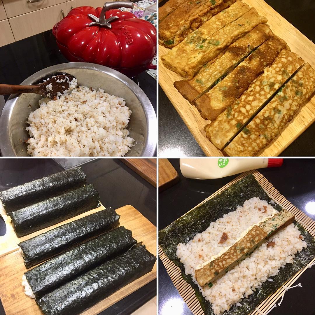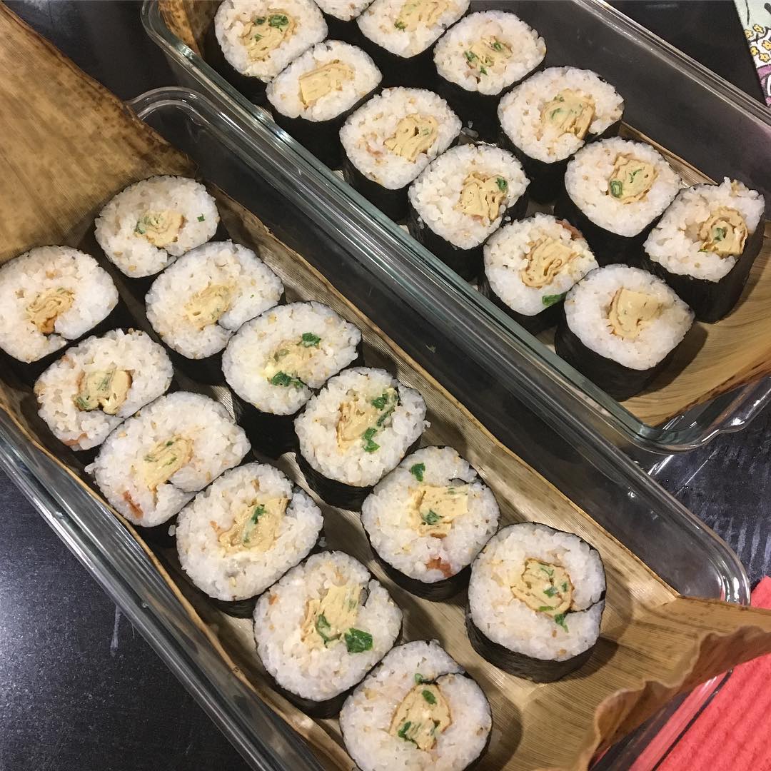 ◯おにぎりと卵焼きの組み合わせは最強だ。しかし、おにぎりの大量生産は手間なので、巻き寿司にしてみた。鍋で炊いたごはんを、酢飯にはせず、鰹節やゴマ、梅干しをちぎったものなどを混ぜ込む。刻みネギを加えた出し巻き卵を作り、巻く。実はこれ、我が夫の好物でもあり、たまに作っている。見た目は地味だが、ほっとする味なのだ。