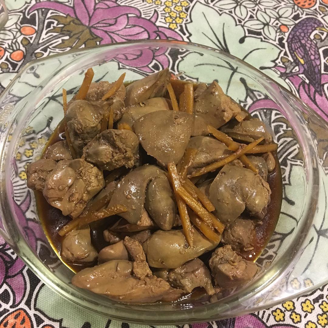 ◯鶏肉のレヴァーは、甘辛煮に。ハムと並んでおつまみによい。チェリートマト(オリーヴオイルとバルサミコ酢で味付け)や、白菜の浅漬け(茅乃舎のだしを揉み込むだけ)など、脇役な野菜も大切。