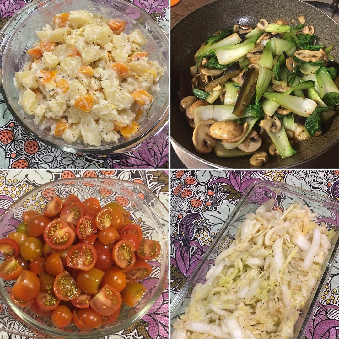 ◯ナスと青梗菜とマッシュルームは、ザーッと炒めて、甜麵醬で味付けした。そしておまけに、ポテトサラダ。もう、お腹いっぱい。