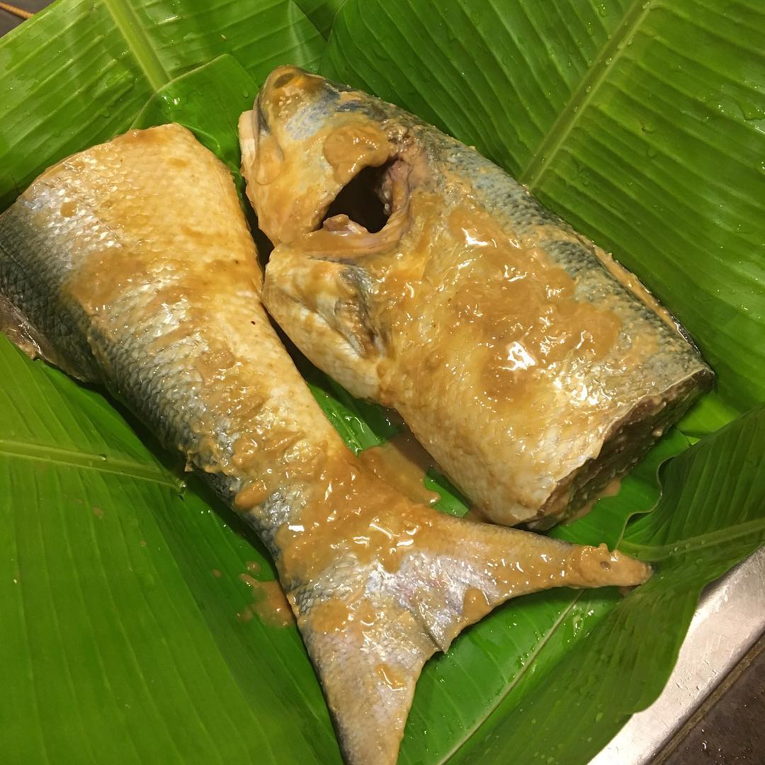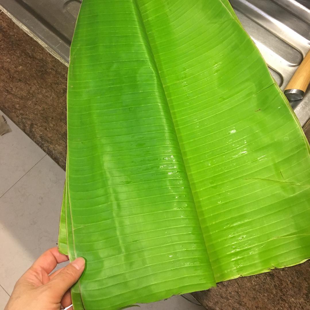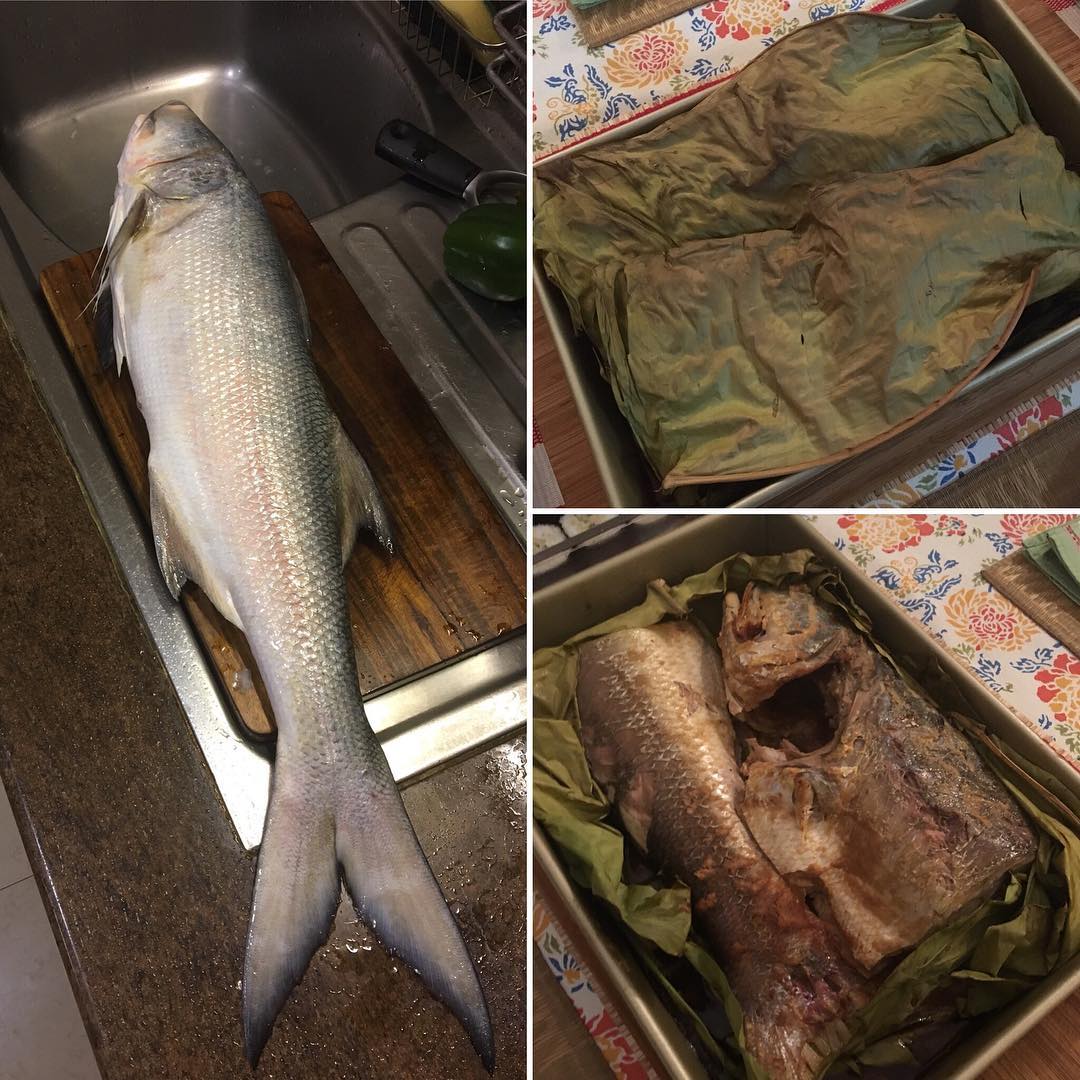 ◯Freshtohome.comで注文したインディアンサーモン。これも前夜のうちに味噌に漬け込んでおいた。サイズ指定ができず、今回は巨大すぎる1匹しかなく、捌くのがたいへんだった。魚の胃袋の中に、小さな魚やエビ、カニなどが入っていて、食物連鎖を目の当たりにするもをかし。バナナの葉で覆って、オーヴンで蒸し焼きに。南インド料理の「お皿」でもあるバナナの葉は、エコロジカルで実用的だ。オンラインのスーパーマーケット、BigBasketで購入できる。