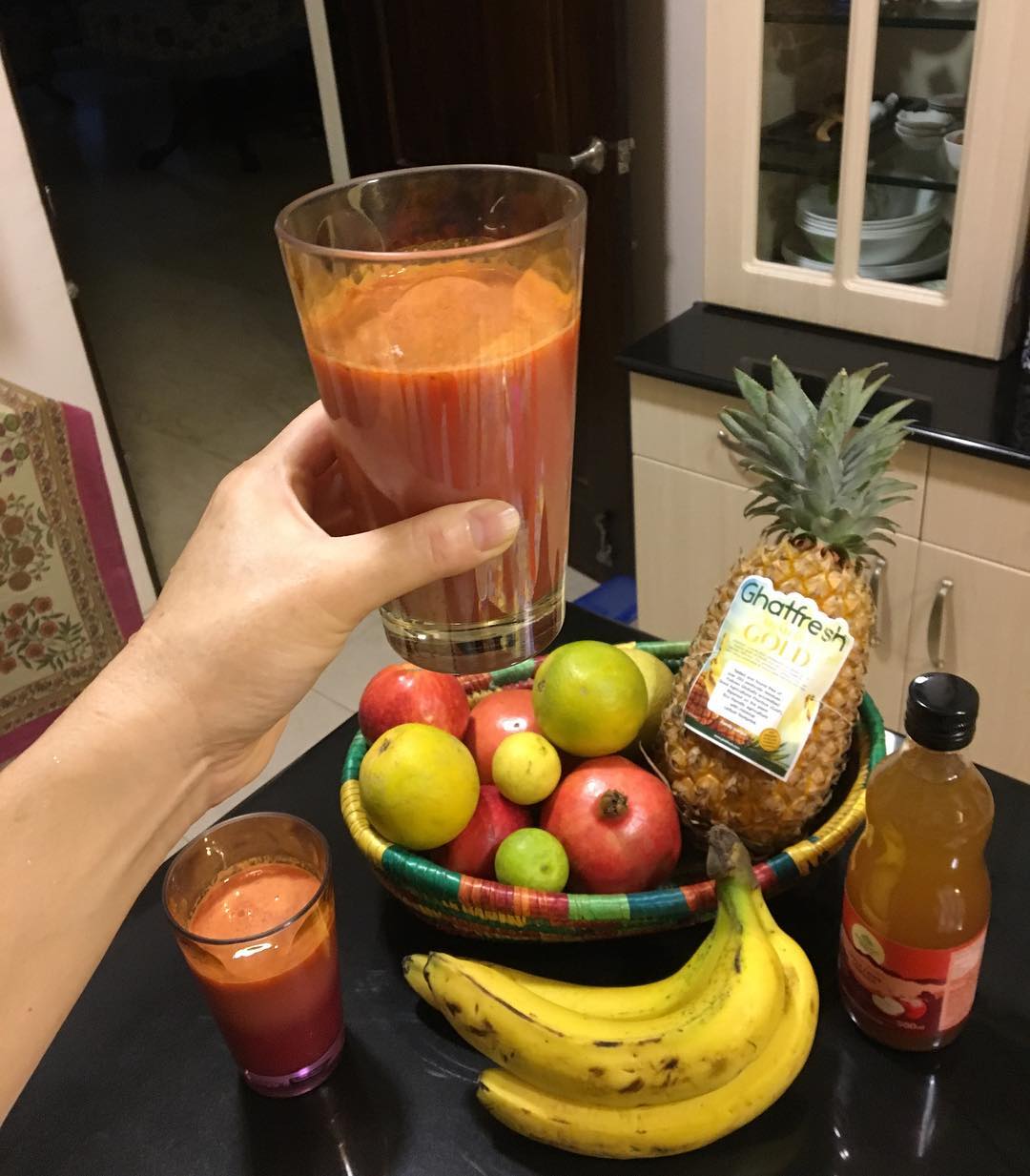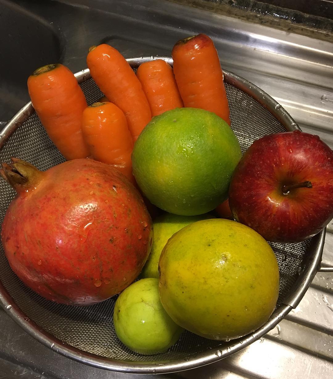 空気は澄み、凛と冷たい朝。にんじん、ムサンビ(スイートライム)、ザクロ、レモンが基本の、いつもの新鮮ジュースを作る。