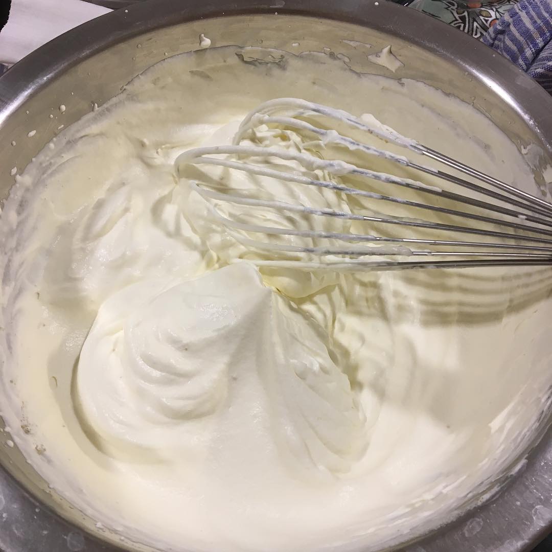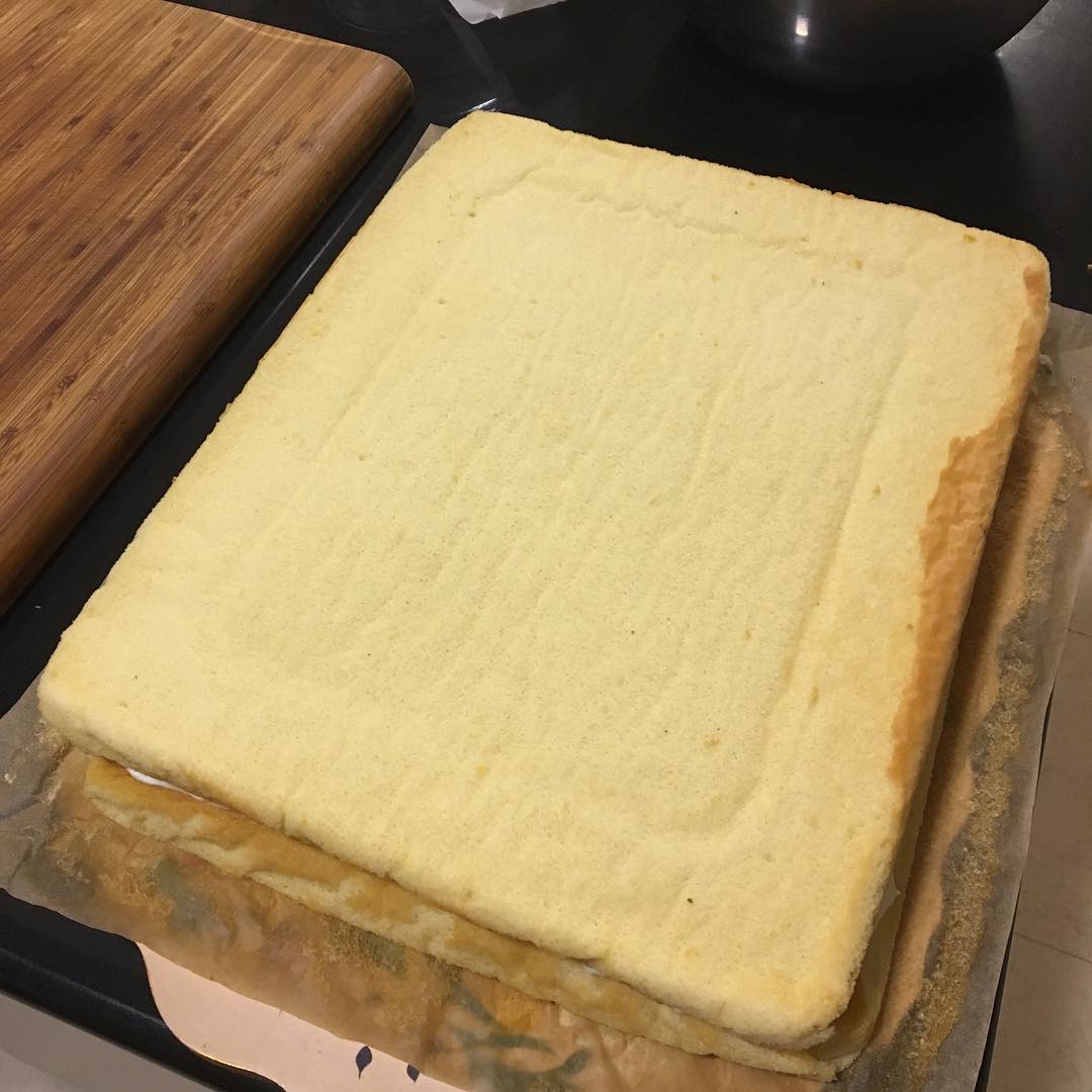 🍳材料は、卵、砂糖、小麦粉、コーンスターチ(コーンフラワー)のみ。バターは使わない。卵と砂糖をしつこく泡立てるのが、コツといえばコツ。ちなみにわたしは、ロールケーキのレシピをそのまま採用。くるっと巻く代わりに、2ロール分を焼いて、重ねただけである。生地が薄いゆえに、焼き時間も12分程度と短い。計24人分。写真は朝組メンバーの分をすでに切り分けているので、ほぼ正方形だが、最初は長方形である。