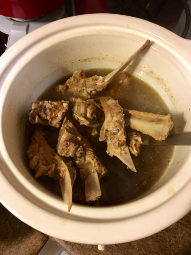 そして昼過ぎ。矢も楯もたまらず、別の料理のために準備していたポークスペアリブの骨の部分だけを削り取り、スロークッカーに入れる。夕方すぎには、いいだしが出ていた。これにいただきものの茅乃舎の鶏スープも加える。そしてしょうゆ、塩、バルサミコ酢少々で味付け。