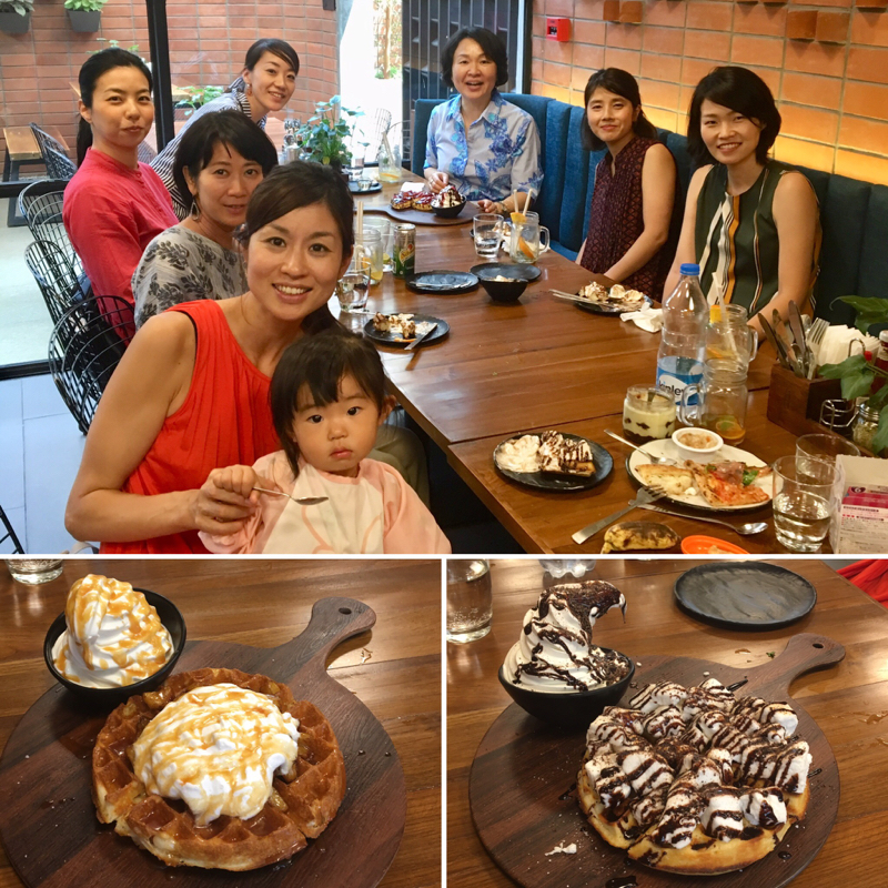 一般に、日本の女子はあまり食べないと思いきや! 7.5名の参加者に対し、サラダに加え、そこそこに大きいピザ5種類。さらにはデザートのワッフル3種&ティラミス。……を、ほとんど食べ尽くす、食欲旺盛さ。気持ちのよい食べっぷりだ。