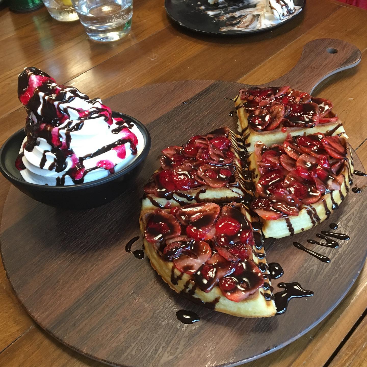 自分では決して頼むことのない、生クリームとアイスクリームがたっぷりの、アメリカンなワッフル。少しばかり味見をしたら、これが結構、いける。危険極まりないデザートだ。
