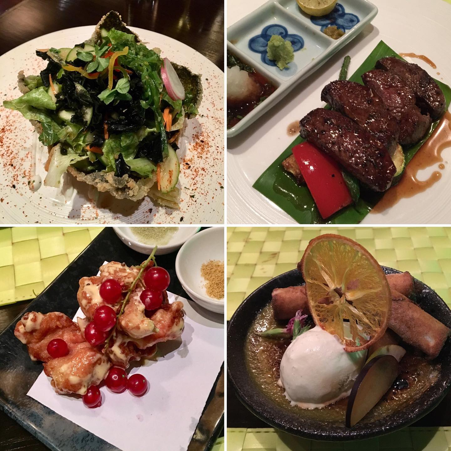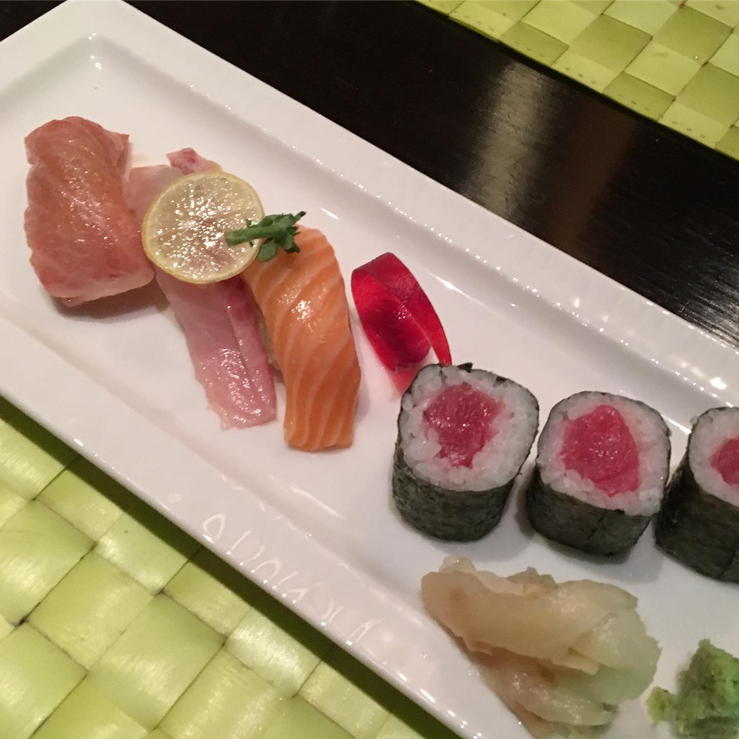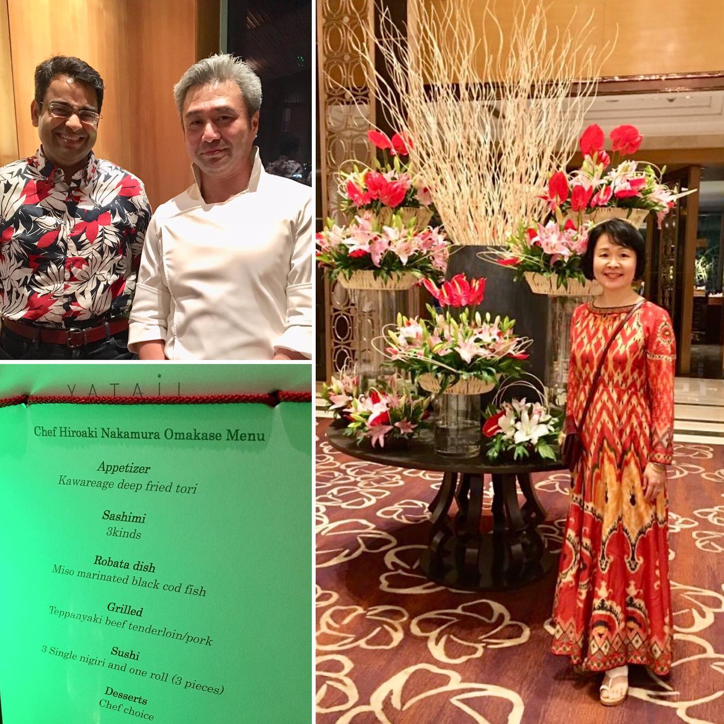 さて、中村シェフは、北海道釧路にご自身の店を持つシェフで、モルジブやドバイなど、他国でのシェフ経験もおありだという。コースメニューは鶏の唐揚げに始まり、刺身盛り合わせ、銀ダラの西京焼き、フィレ肉のグリル、寿司、デザートという内容。刺身の盛り合わせには、なんと大トロも添えられている。なんでもシェフ自ら、日本より持ち込まれたとのこと。とてもおいしい。