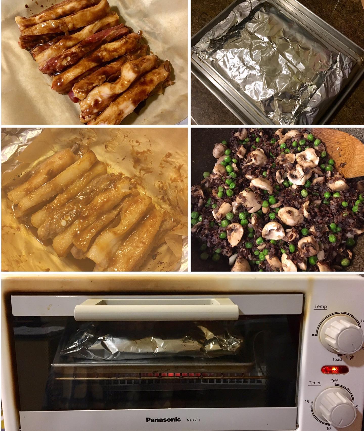 スペアリブを並べ、西京味噌を塗り塗りし、軽く塩と醤油をかけて包み、「オーヴントースター」で30〜40分ほど焼く。低中温で長時間焼くほうが、多分、肉が柔らかくなる。タイマーは15分しかないので、2、3回、巻き戻す。ただそれだけの、簡単さ。