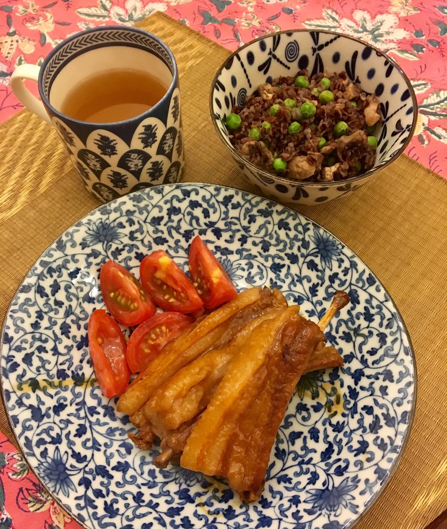 昨夜炊いたヘルシーなブラックライスの残りを、軽く茹でたグリーンピースと使いそびれていたマッシュルーム(乱暴に、手で握りつぶす)で炒める。マッシュルームは包丁で切るより、手でクラッシュしたほうがおいしい気がする。