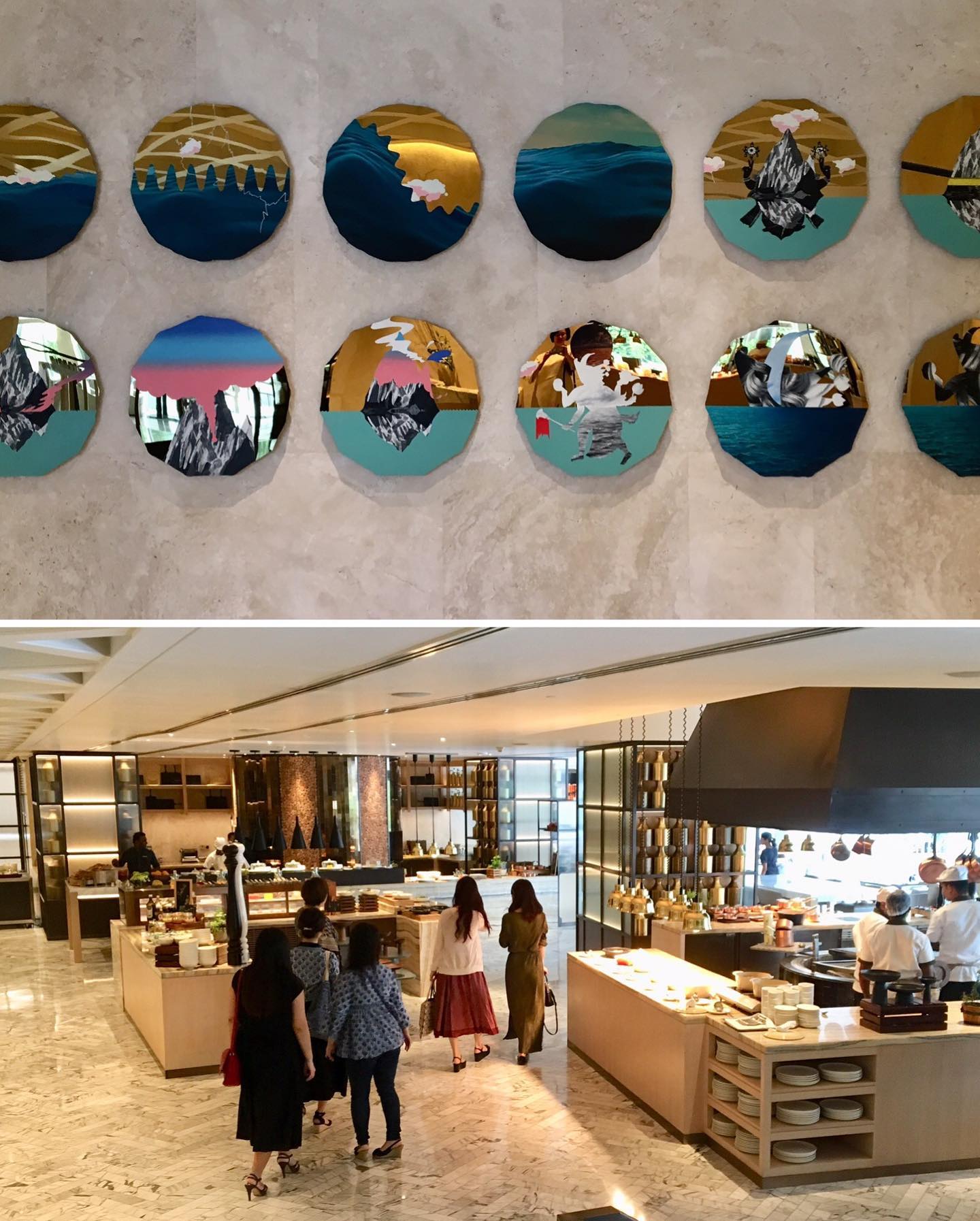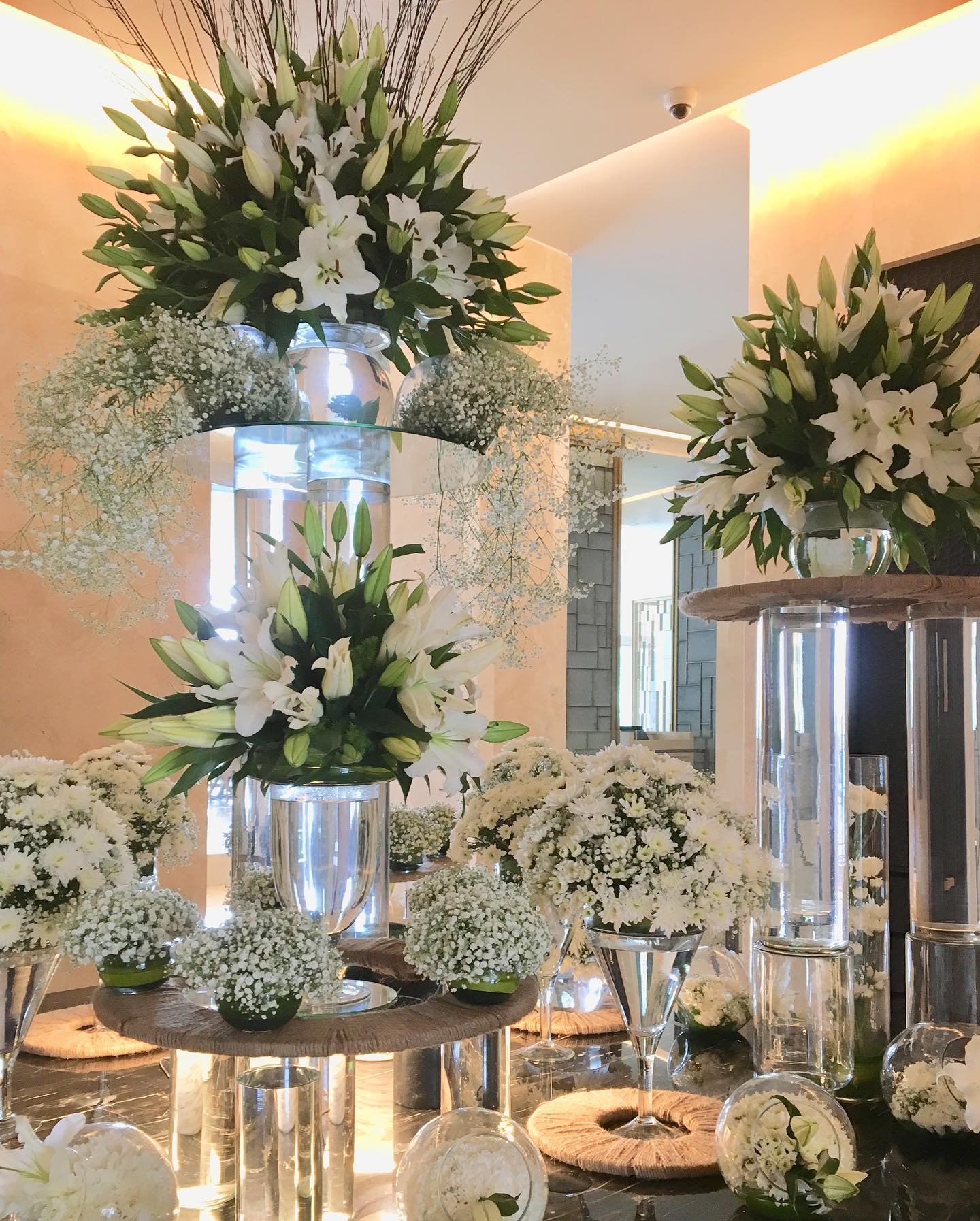 会場は、先ごろオープンしたばかりのFour Seasons Hotel。ロビーホールから、階下のカフェテリア(ダイニング)にかけては、白い大理石の優雅さを引き立てるように、重なり合う白い花々のアレンジメントも麗しく、心地のよい空間だ。