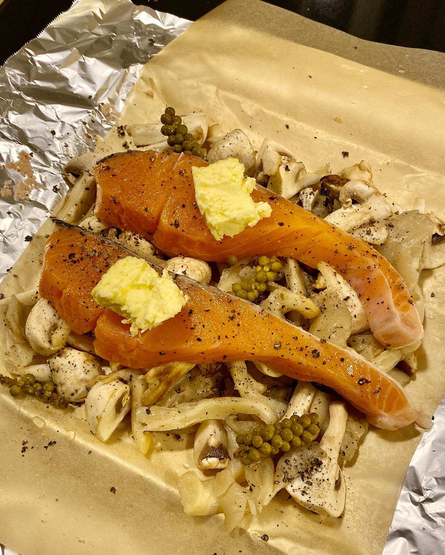 今日は外出ができなかったので、BIGBASKET.COMで、マッシュルームやオイスターマッシュルームも頼む。あと、自宅にあった乾燥シイタケなども駆使して、キノコ類を準備。バターと岩塩、自家製のペッパーなどを添えてホイルで包み、オーブントースターで蒸し焼く。簡単すぎるほどに簡単にできる。