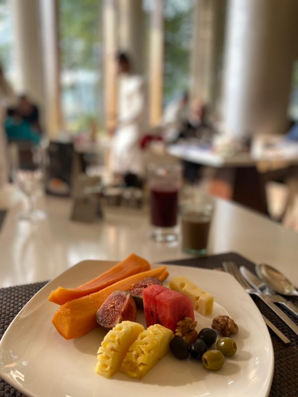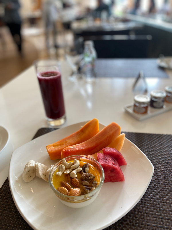 まずはフルーツ盛り合わせからスタート。ヨーグルトの上にマンゴー&ピーチのピューレを載せ、ナッツ類をトッピング。おいしい。