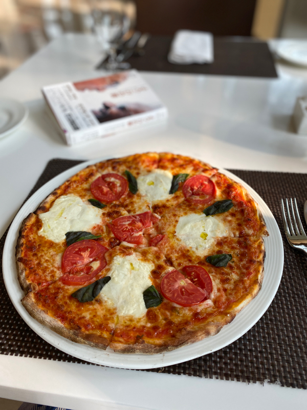 これはホテルでのひとりランチ。窯焼きピザ、旨し。