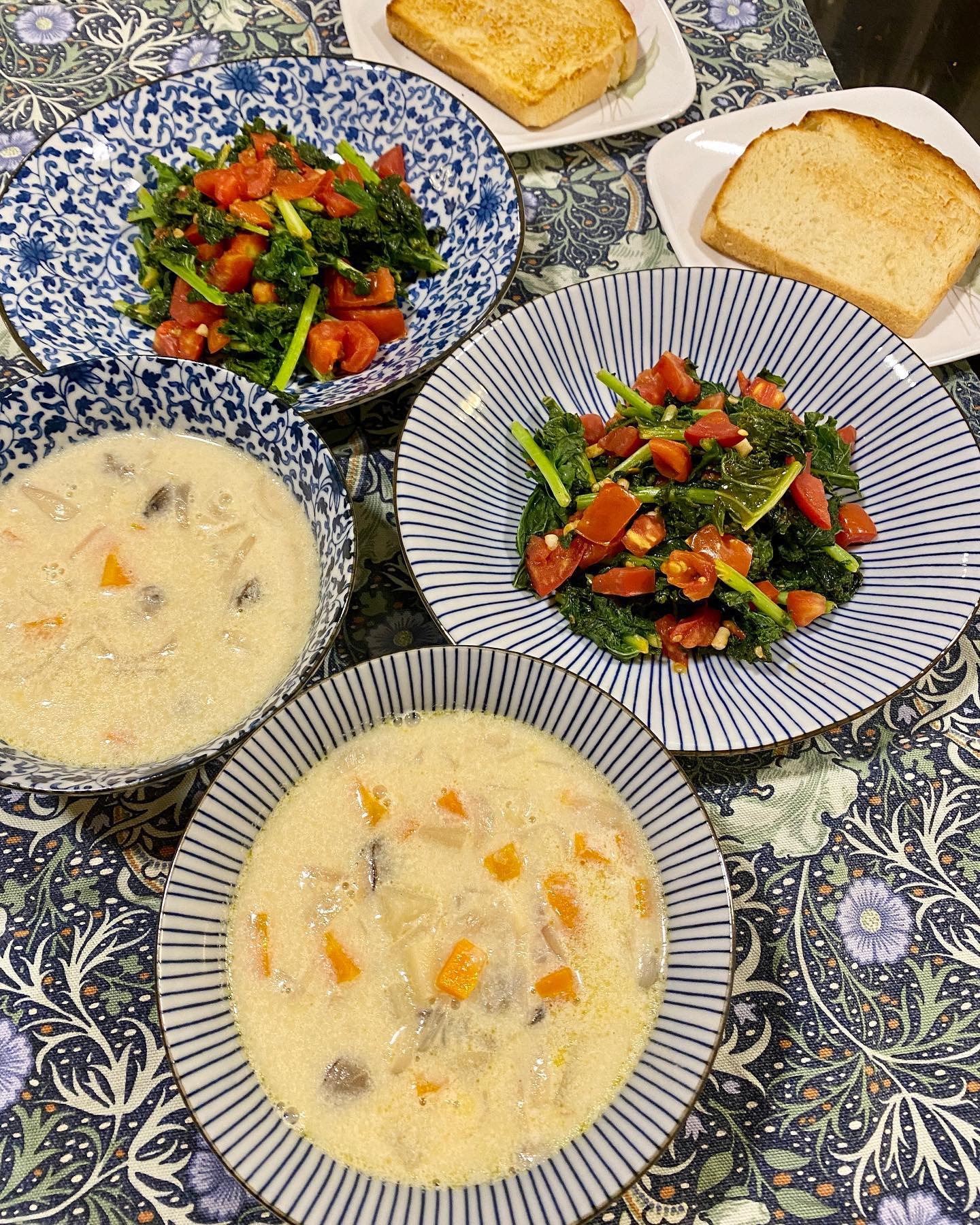 モーニンググローリー(空芯菜)の葉は、オリエンタル風の味付けにすると日本米によく合う副菜となる。手に入るもので工夫しつつ、暮らしている。