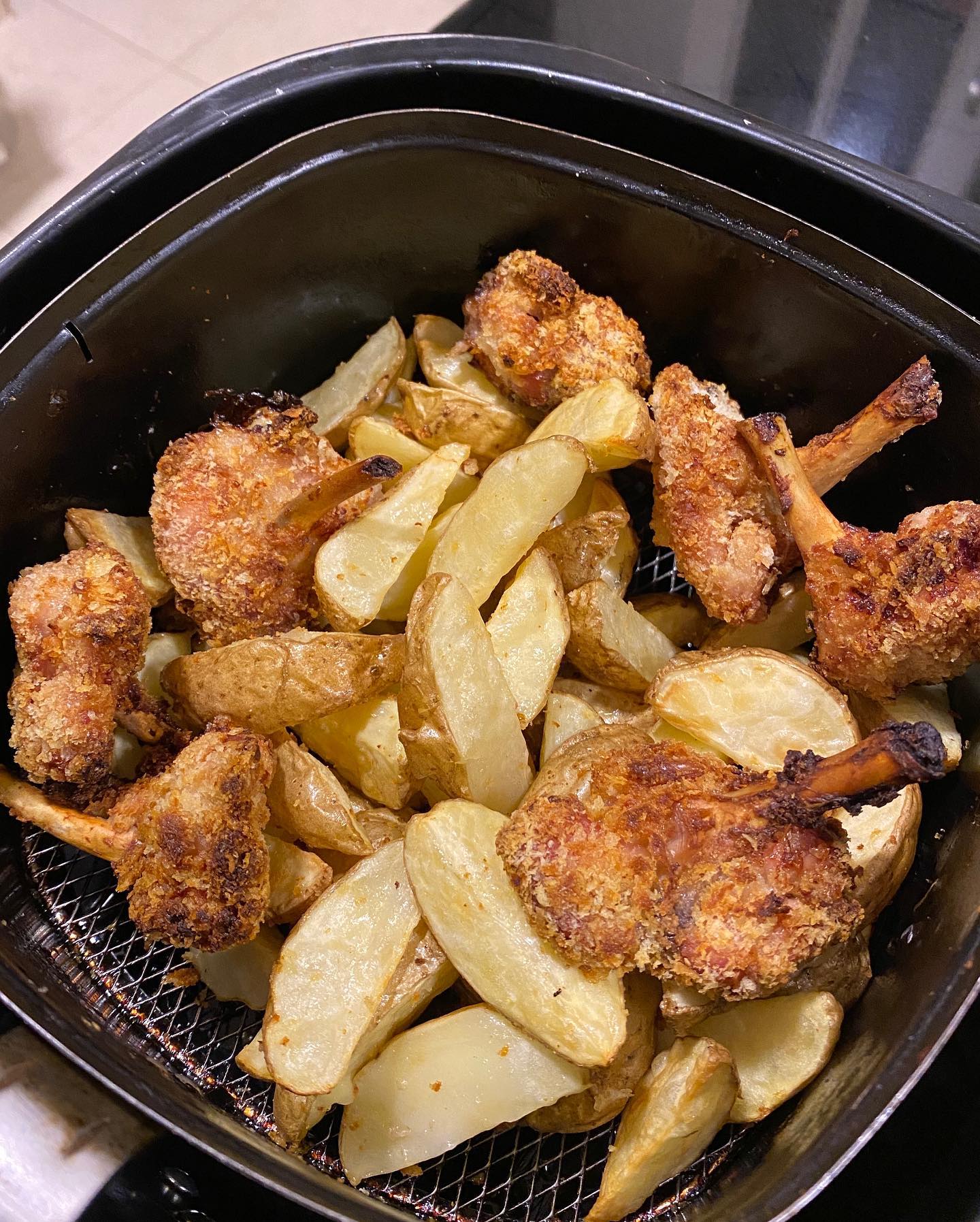 Freshtohome.comにそのときどきあるもので、何かしらを作る。エアフライアーで鶏のフライとフライドポテトを同時に作るというのは、極めて時短でおいしい。オーガニックの野菜は、ざっとタワシで洗えば、皮をむかずに食べられるからよい。