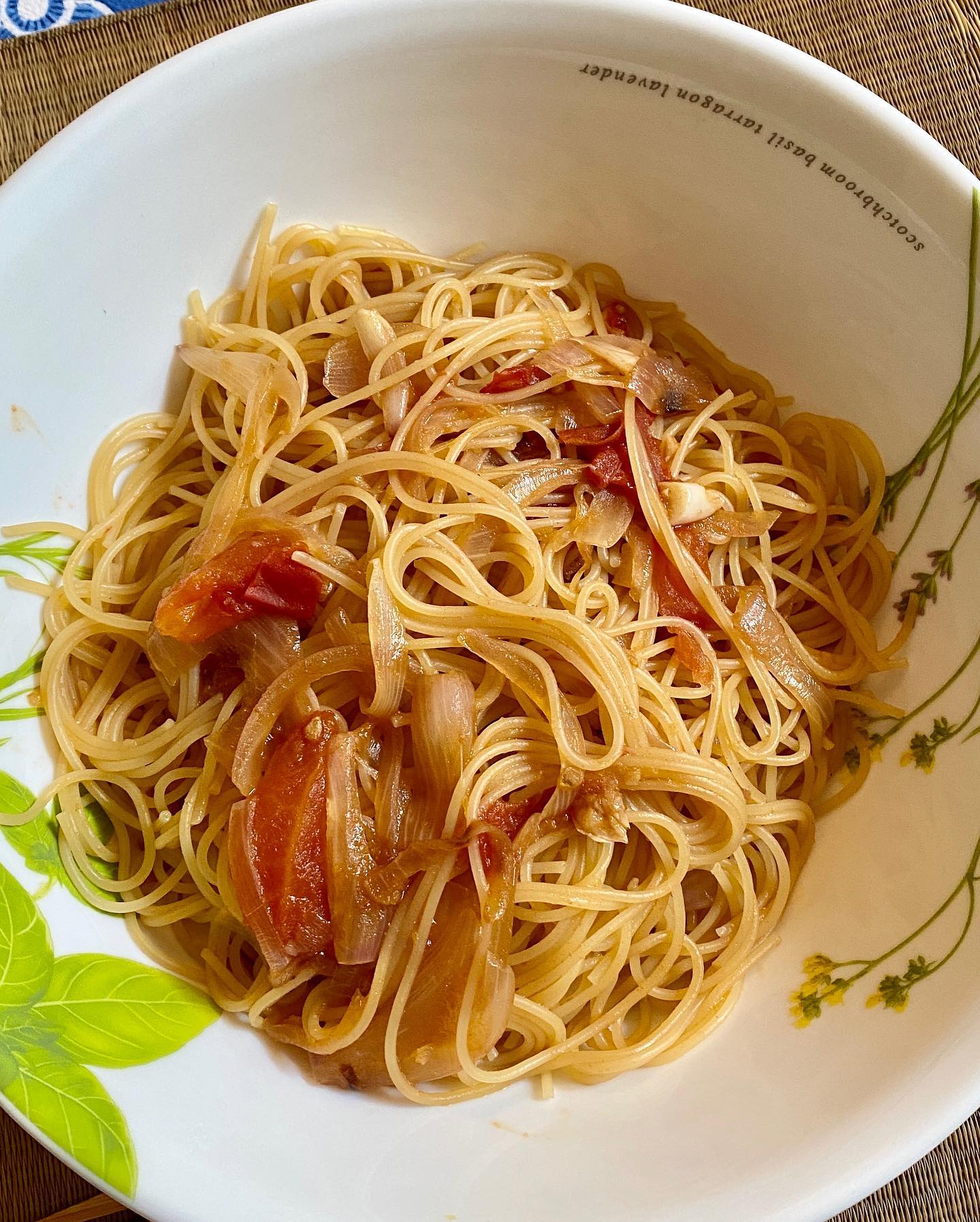 パスタは、数種類を買い貯めているが、エンジェルヘアパスタは、茹で時間3分という短さが長所。パスタは、そうめんやうどんのように、茹でたあとに水にさらす必要がないので、浄水を節約できていい。別々に茹でるのが面倒な時は、薄いソースならば、パスタをそのまま投入して加熱すればよい。お吸い物的なスープの残りにそのまま投入して加熱するだけでもいい。超インスタントである。