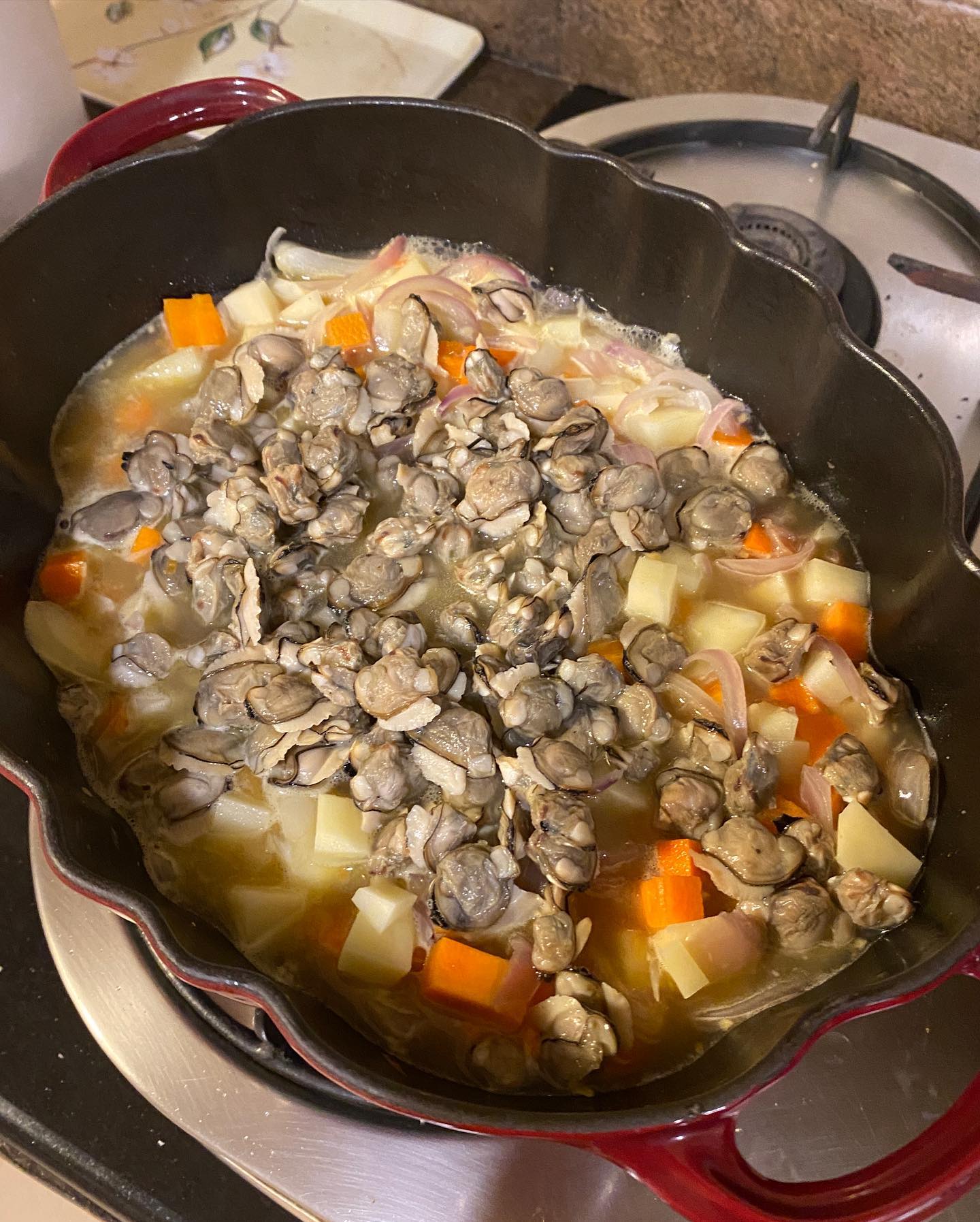 Freshtohome.comでは、現在、取り扱っている魚の種類が少なく、エビとかクラム(貝のむき身)など、取り敢えず買う。最小ロットが大きいので、小分けにして冷凍する。一昨日は、間違って牛乳を買いすぎたので、クラムチャウダー風を作った(あくまで我流)。