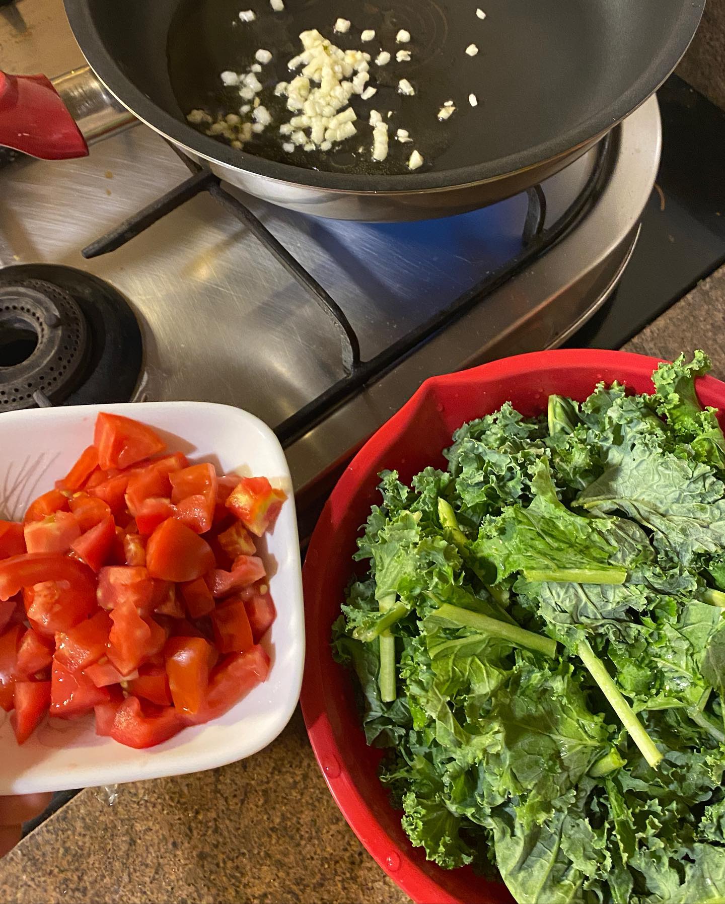 Gourmetgarden.inの新鮮野菜は本当に重宝! 今回のロックダウンを契機に買い始めたが、多彩な葉野菜をモリモリ食べられるのがいい。生だけでなく、たとえばヴィタミンC、E、Kなどが豊富な緑黄色野菜の王様ケール。そのまま食べると苦味があるが、ニンニクと炒めてトマトのざく切りを加えて調理すると食べやすい。
