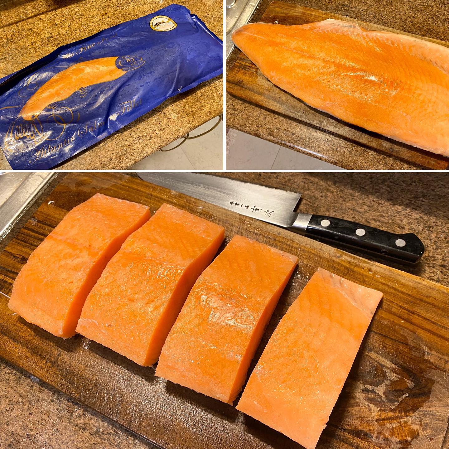 🐟ちなみにサーモンも、ど〜んとパッケージで届くので、届いた直後の少し解凍しかけているときに、切り分ける。端と尻尾に近い部分は加熱調理して食べ、上部のきれいな部分だけ、鱗を取り、皮を剥いで適当に切り分けて個別に冷凍保存。我が家では4食分の刺身となる。ちなみに皮の部分も小さく切って香ばしく焼き、サラダのトッピングなどに使う。これがまた旨いのだ。