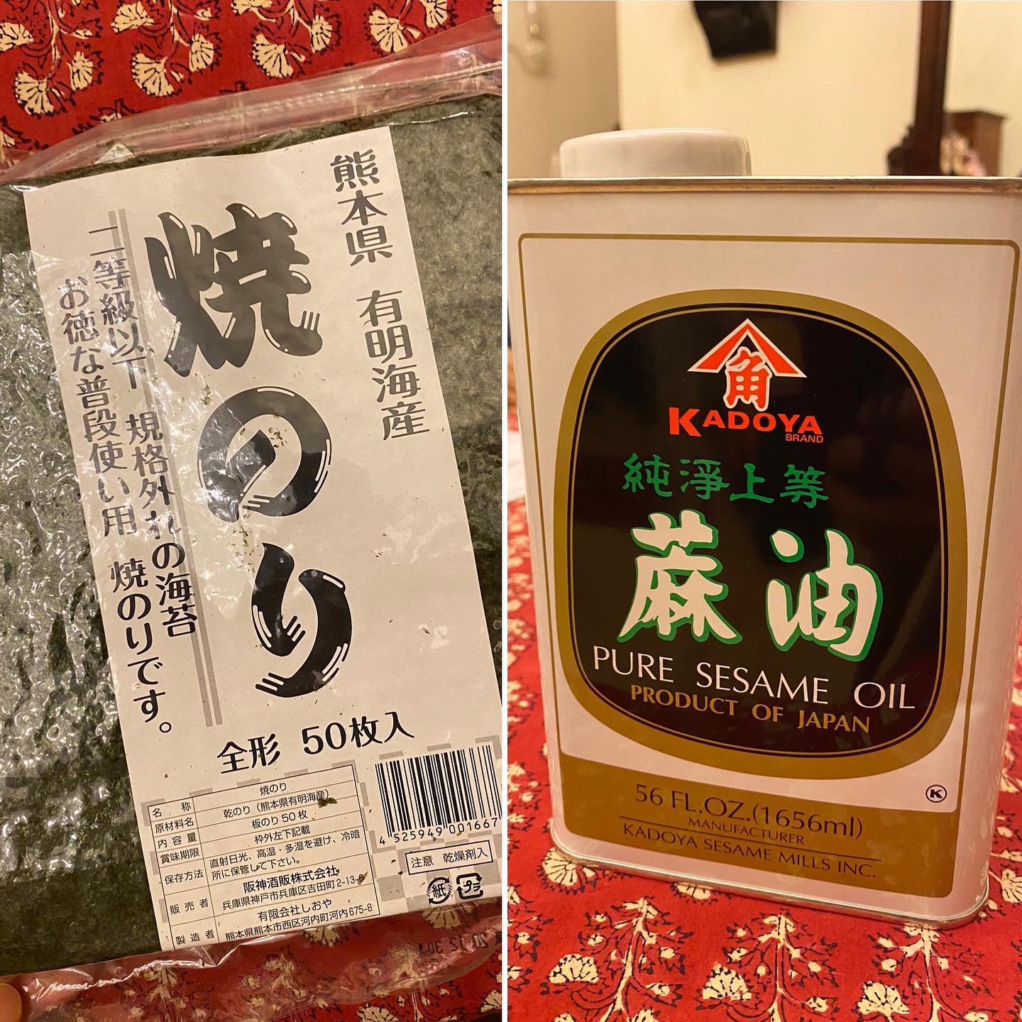 🍙しかし、わたしの中の日本人が「海苔を食わせろ」と叫ぶ。正体不明な海苔が届くのを覚悟でDaily Needに注文したところ……。開封して驚愕!「熊本県有明海産焼きのり」ではないか! 思わず小躍り💃 「2等級以下、規格外の海苔」ノープロブレム。これで巻き寿司などもできるというものだ。更には、ごま油も「かどや」ものがど〜んと届いた。この際、「いつもの九鬼太白純正胡麻油でなきゃいやだ」などと贅沢は言わぬ。