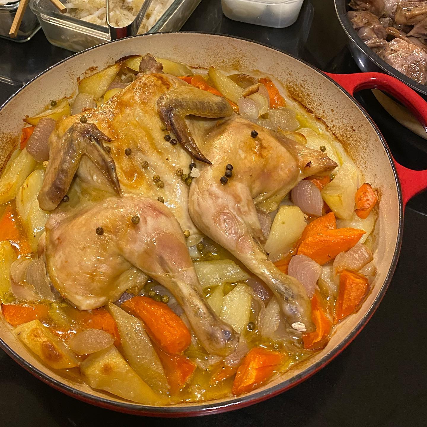🐓ジャガイモ、玉ねぎ、人参を適当な大きさに切り、ニンニクなどをちりばめ、オリーヴオイルとシーソルトと胡椒で和える。その上に、背骨の横をハサミで切って(簡単に切れる)開きにした鶏肉を載せ、バターやオリーヴオイルなど好みの油脂をかけて、これも塩胡椒をし、オーヴンで焼くだけ。
