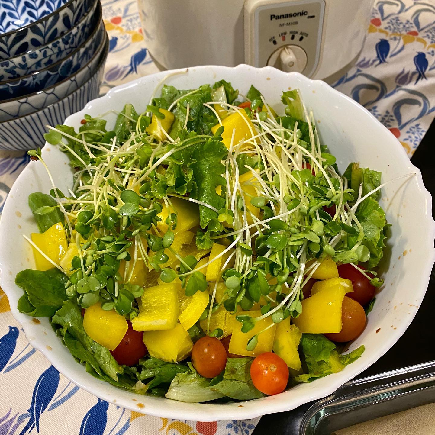 🌱サラダは、オーガニック野菜や水耕栽培の新鮮葉野菜を販売するGourmetGarden.inで調達。かいわれ大根などスプラウト系の野菜も売られている。写真を撮ってはいないが、バンガロールの韓国料理店Arirangで購入した豆腐(絹ごし/木綿両方おいしい)に、鰹節とスプラウトをトッピングして醤油をかけたものも好評だった。