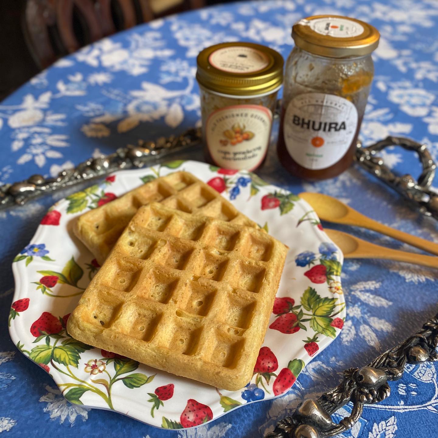 ところでワッフルは、パンケーキよりも手早く簡単に作れる。ワッフル焼き器はインドでも手軽に購入できるのでお勧めだ。生地を流し込みすぎず、表面を均したりせず、ただ軽く中央に垂らして、そっと蓋をするだけで、できあがる。先日紹介した、Bhuiraのジャムともナイスな相性だ。