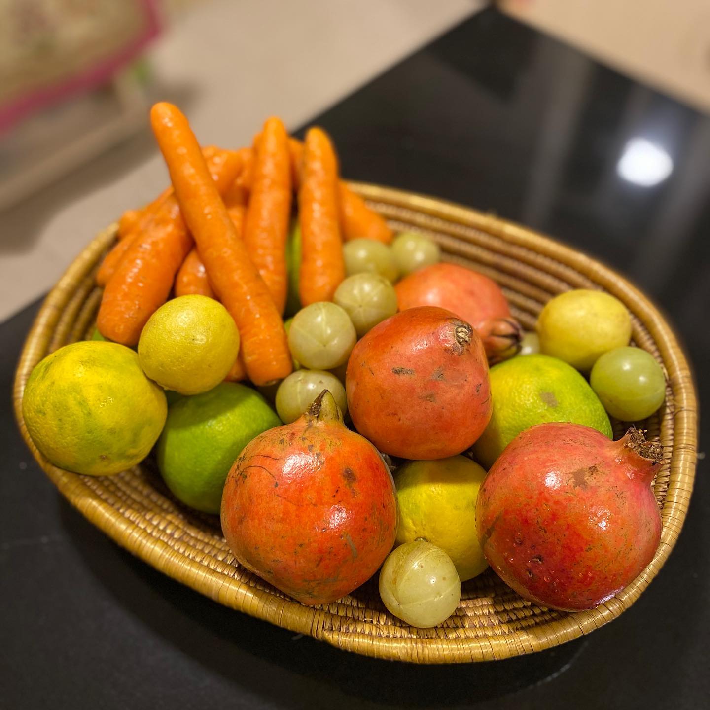 🍋果物のカゴは、我が家が毎朝飲んでいる新鮮ジュースの基本素材。ニンジン、ざくろ、スイートライム(ムサンビ)、アムラ、レモン。これにときどきパイナップルやリンゴが加わる。これを飲んでいれば、ランチが少々手抜きでも大丈夫だと思える。