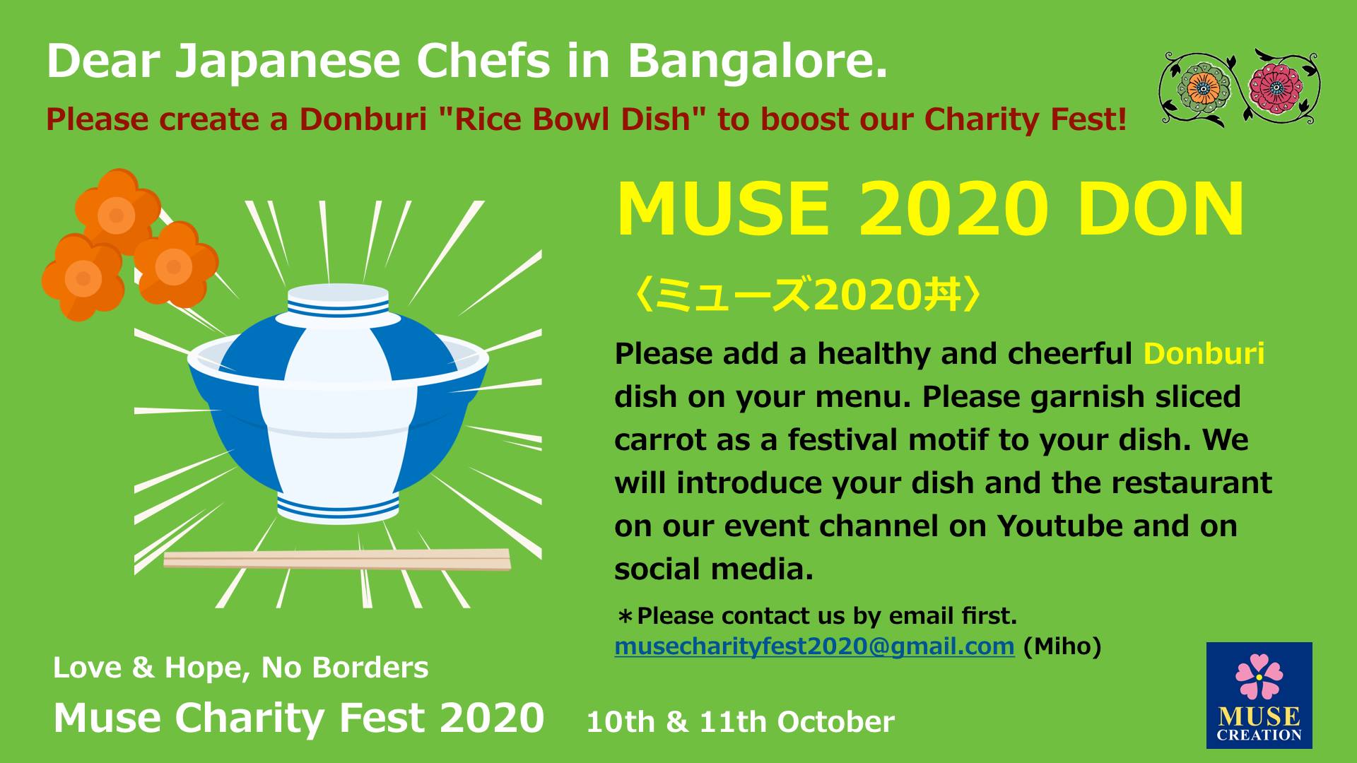 すでに告知しております「ミューズ・チャリティフェスト2020」の企画として、各店舗からヘルシーで独創的な「どんぶり」メニューの創作を募っています。ルールは、「ニンジンの花を飾る」ことです。ヴェジ・ノンヴェジ、どちらでも構いません。