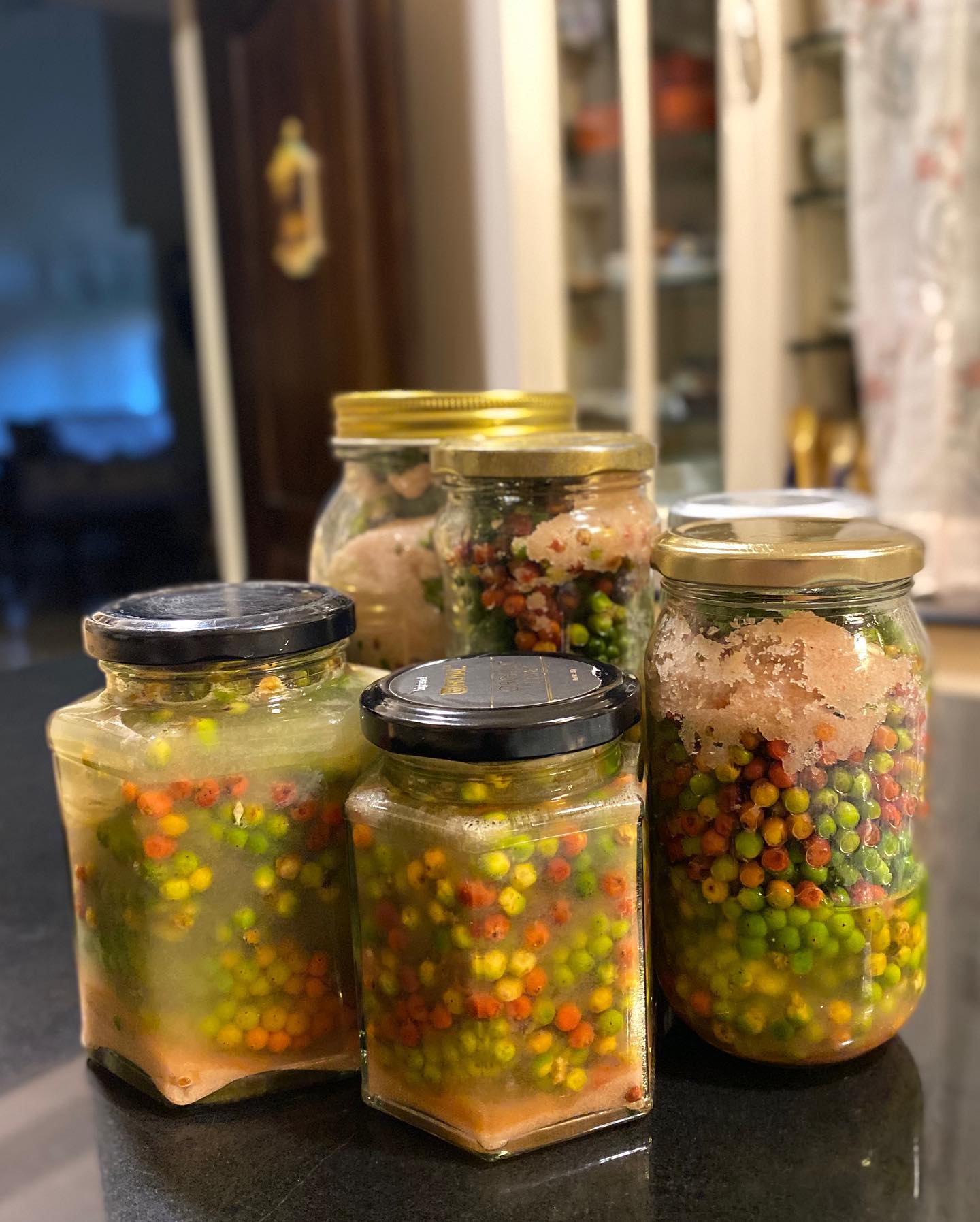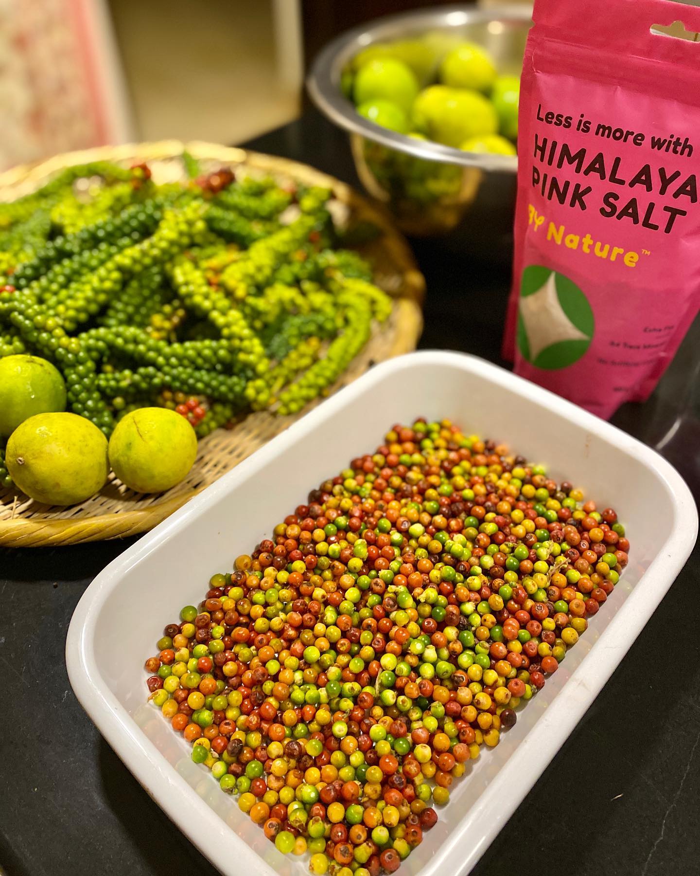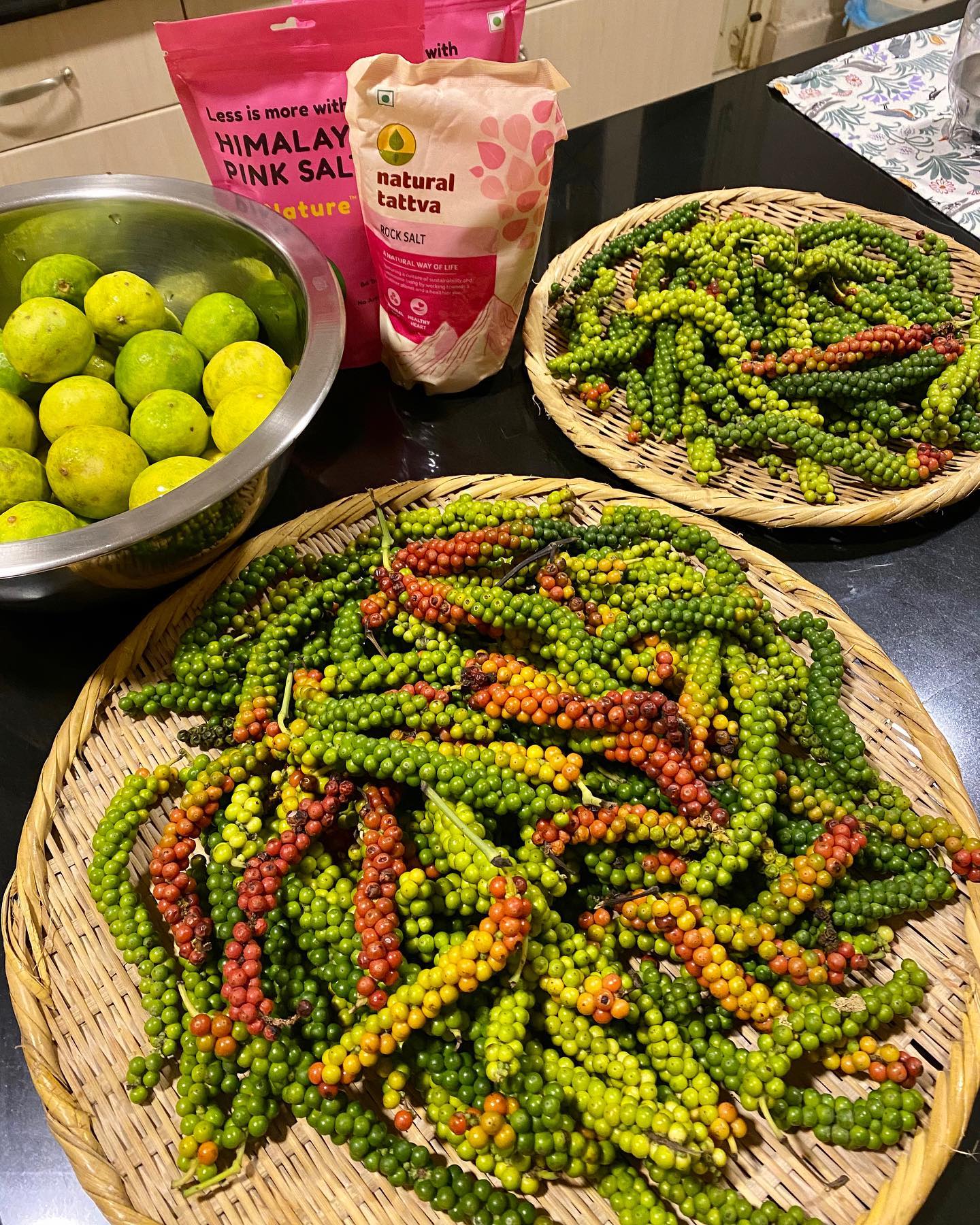 ヒマラヤの岩塩、ピンクソルトと、オーガニックのレモン(インドのレモンはライムのよう)をたっぷり用意。胡椒をベーキングソーダで洗い、乾燥させて、選別しながら瓶に詰める。一旦、湯に通したこともあったが、黒くなってしまうので、今年はやめた。