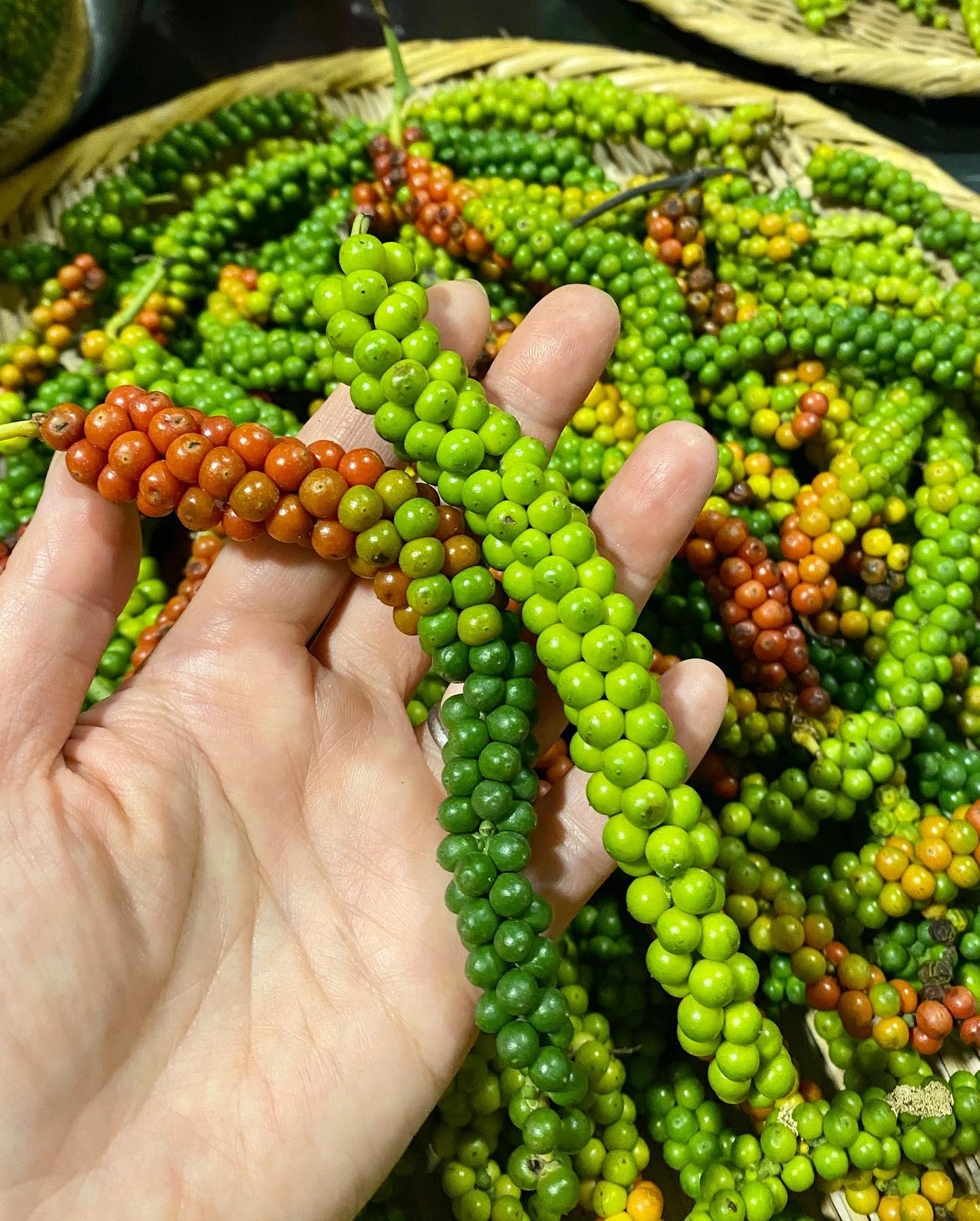 いつもなら、年末に収穫するところ、今年は、熟して赤い実が増えるのを待ってみた。今回の収穫量は少ないが、実がしっかりと、質がよい。赤く熟すると、辛味が軽減されるという。ちなみに、ホワイトペッパーは、この赤い胡椒の皮を剥いだものだ。