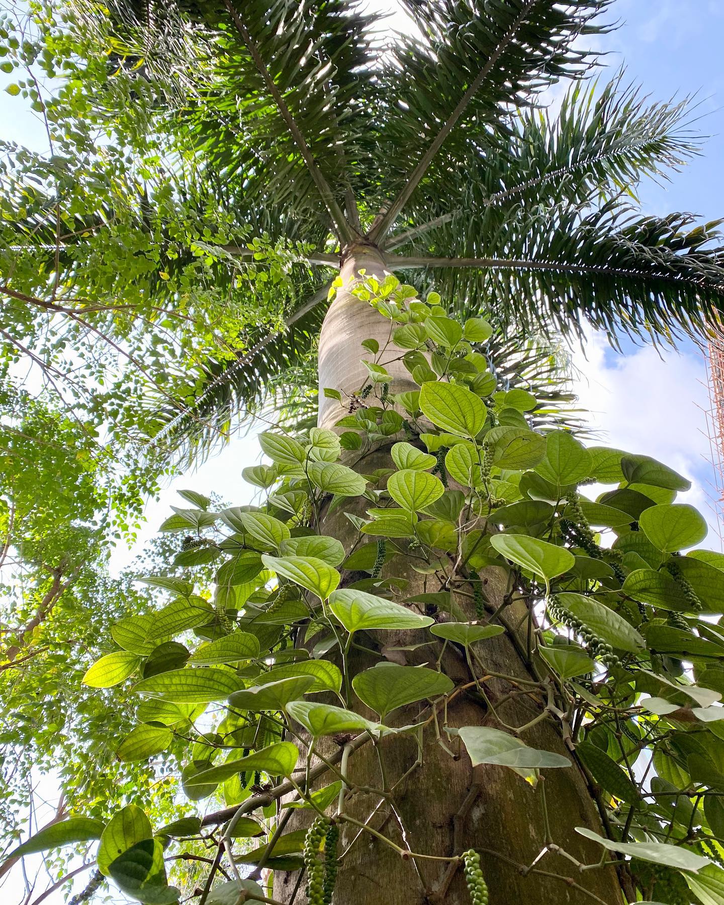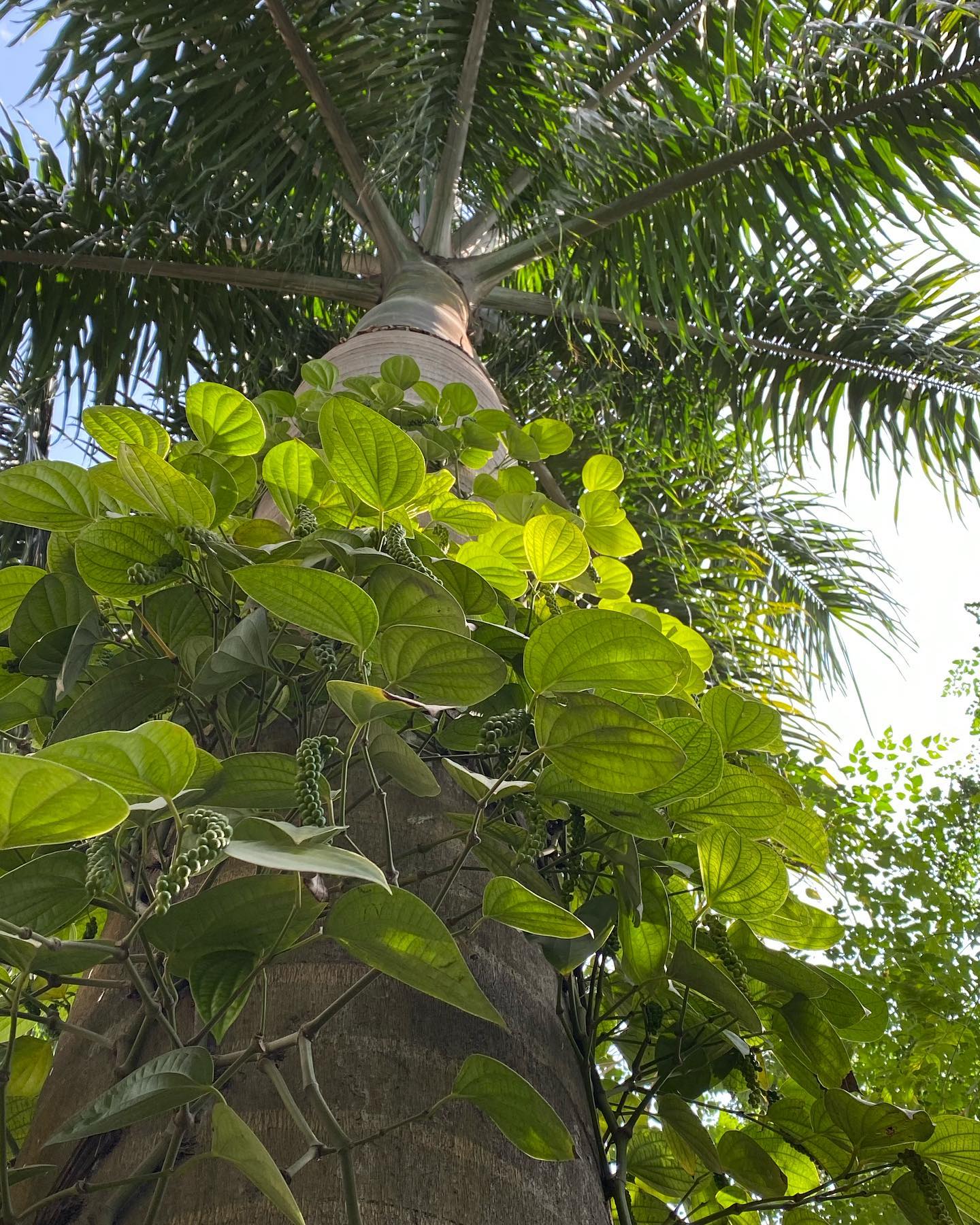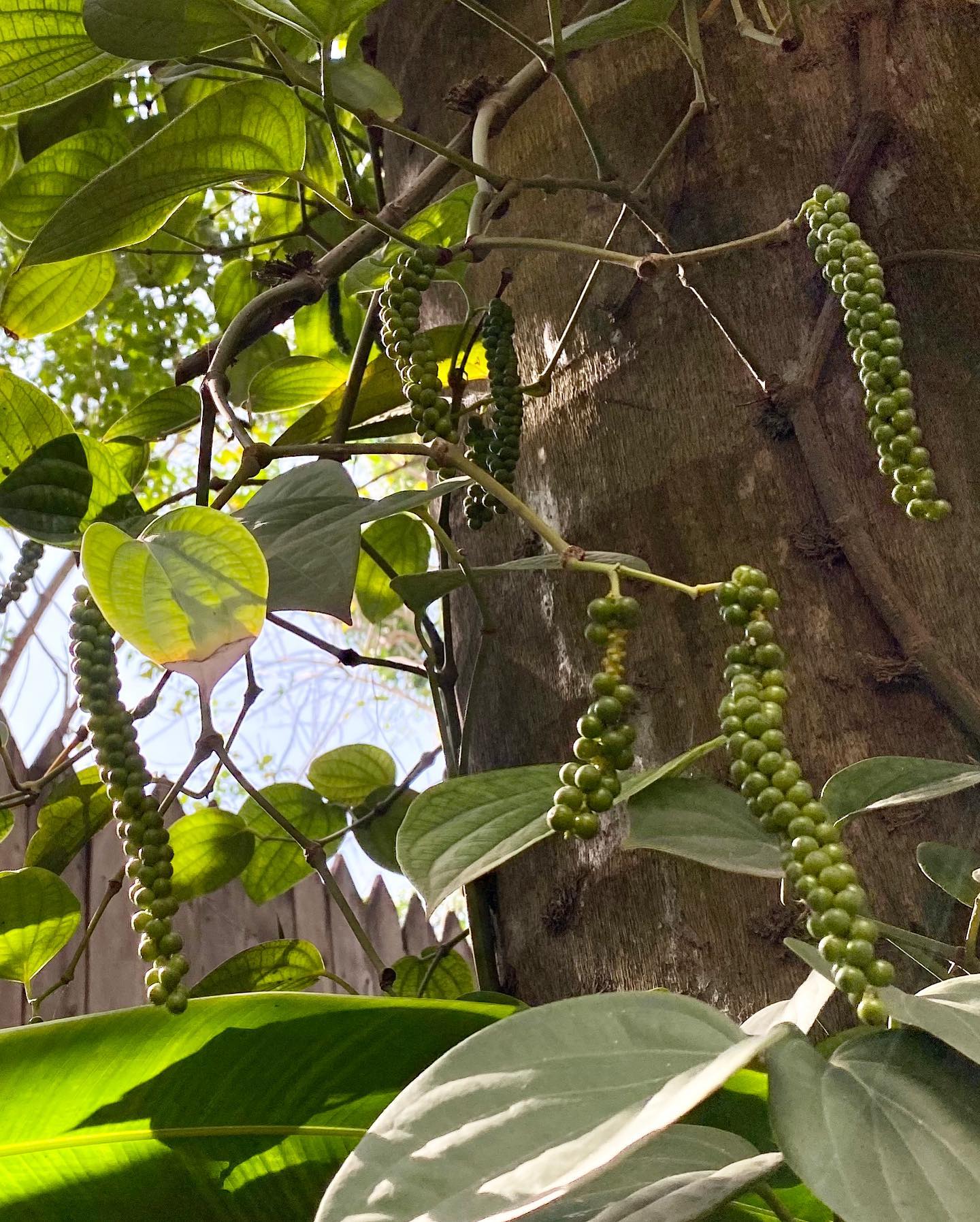 熟した胡椒粒が、彩り豊かに美しい。庭の、ヤシの木のたもとに、小さな胡椒の苗を植えてから、多分10年は経つだろう。とてもゆっくりと成長した、そのツル科の植物が、やがて実をつけるようになって久しい。初めて収穫した時には、自分の庭で胡椒が穫れることが、ひどく特別なことに思えて、うれしかった。